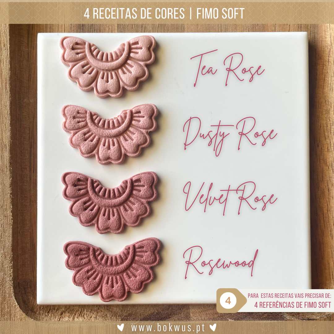 Esta palete de cores DIGITAL contém receitas para a criação de 4 tonalidades de rosa velho utilizando as seguintes referências de FIMO SOFT