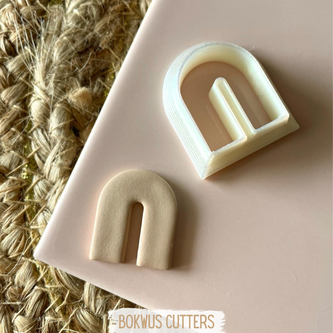 • Cortador e molde de argila em forma de arco sobre superfície rosa e base de fibra natural com texto BOKWUS CUTTERS