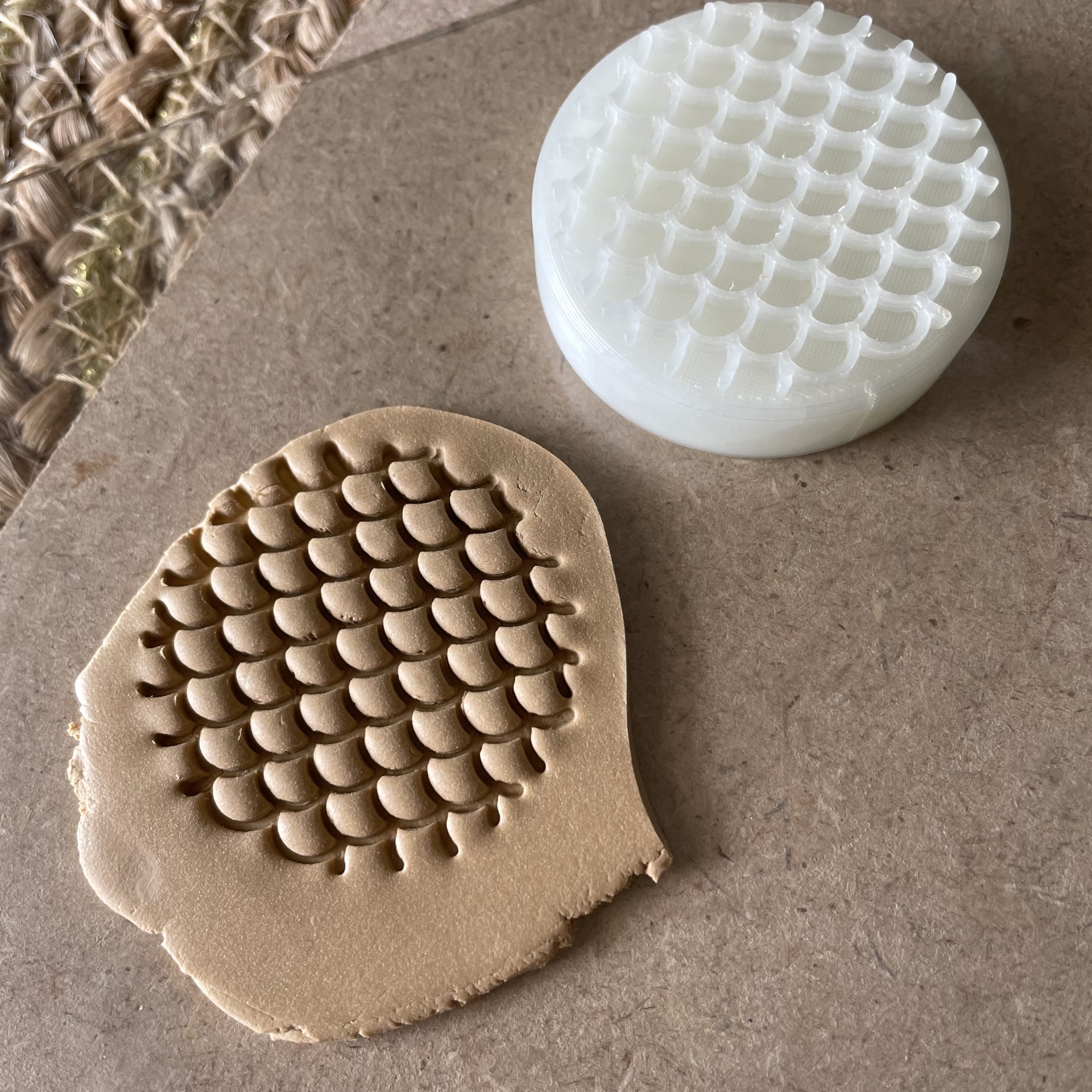 Carimbo plástico branco com padrão de escamas e massa bege com padrão gravado.