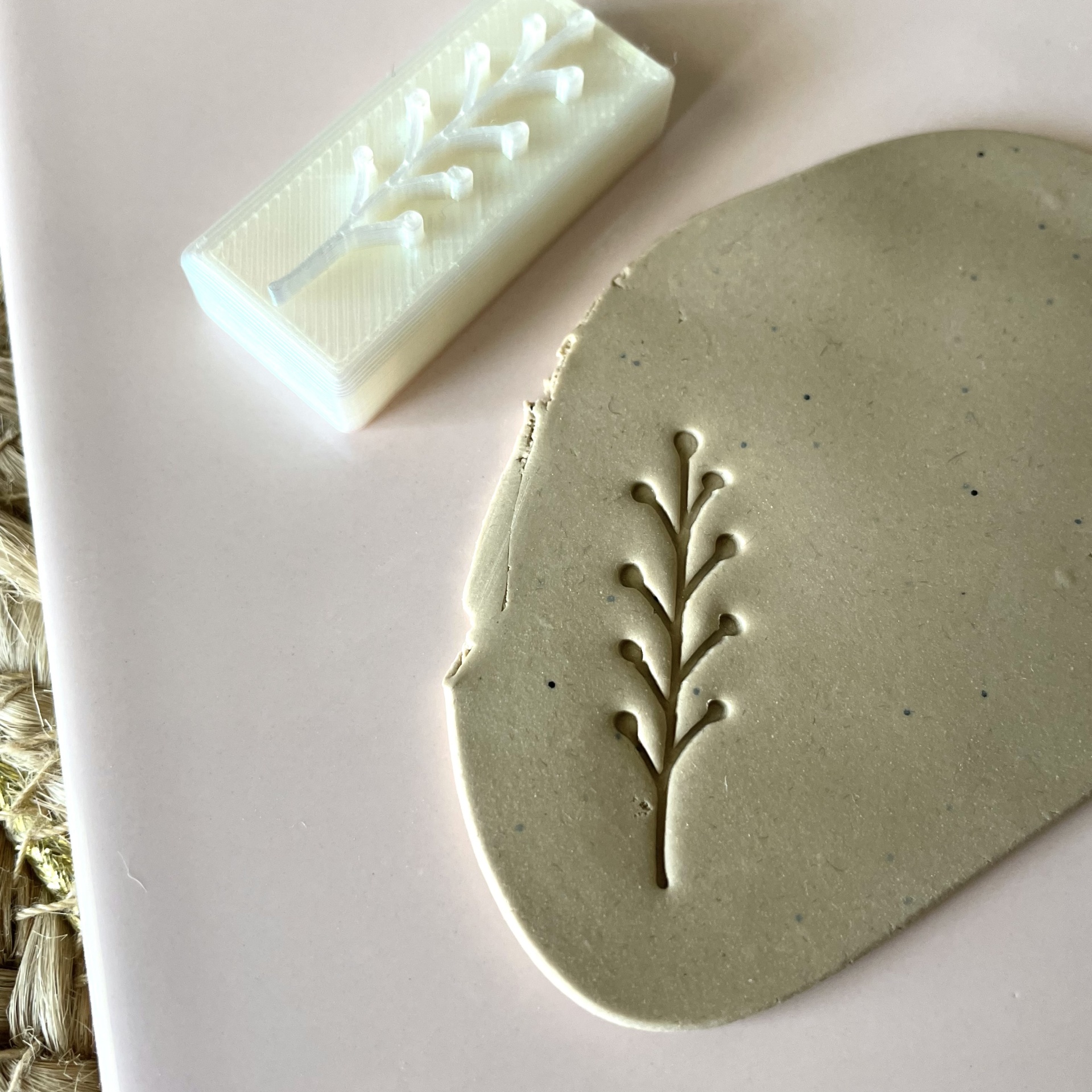 • Carimbo branco em plástico com padrão de ramo, argila cinzenta em superfície rosa