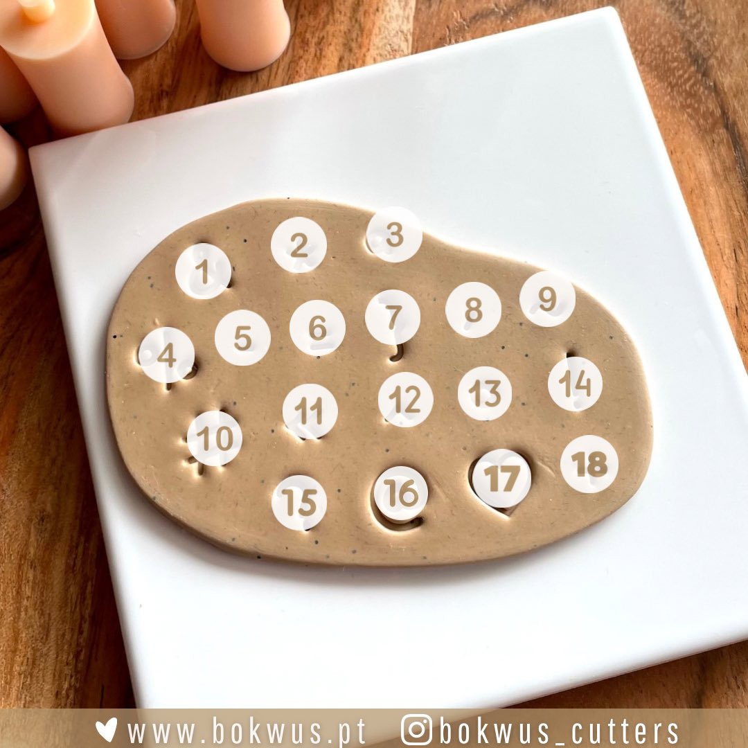 • Cortador de biscoitos ou fondant beige com números e base branca sobre madeira