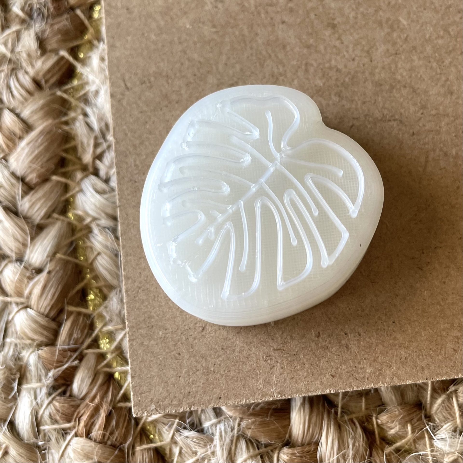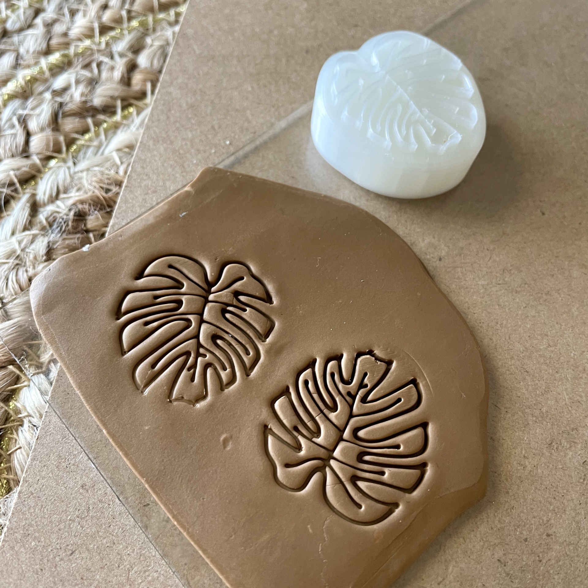 • Selo de silicone branco com padrão de folha sobre argila castanha clara.