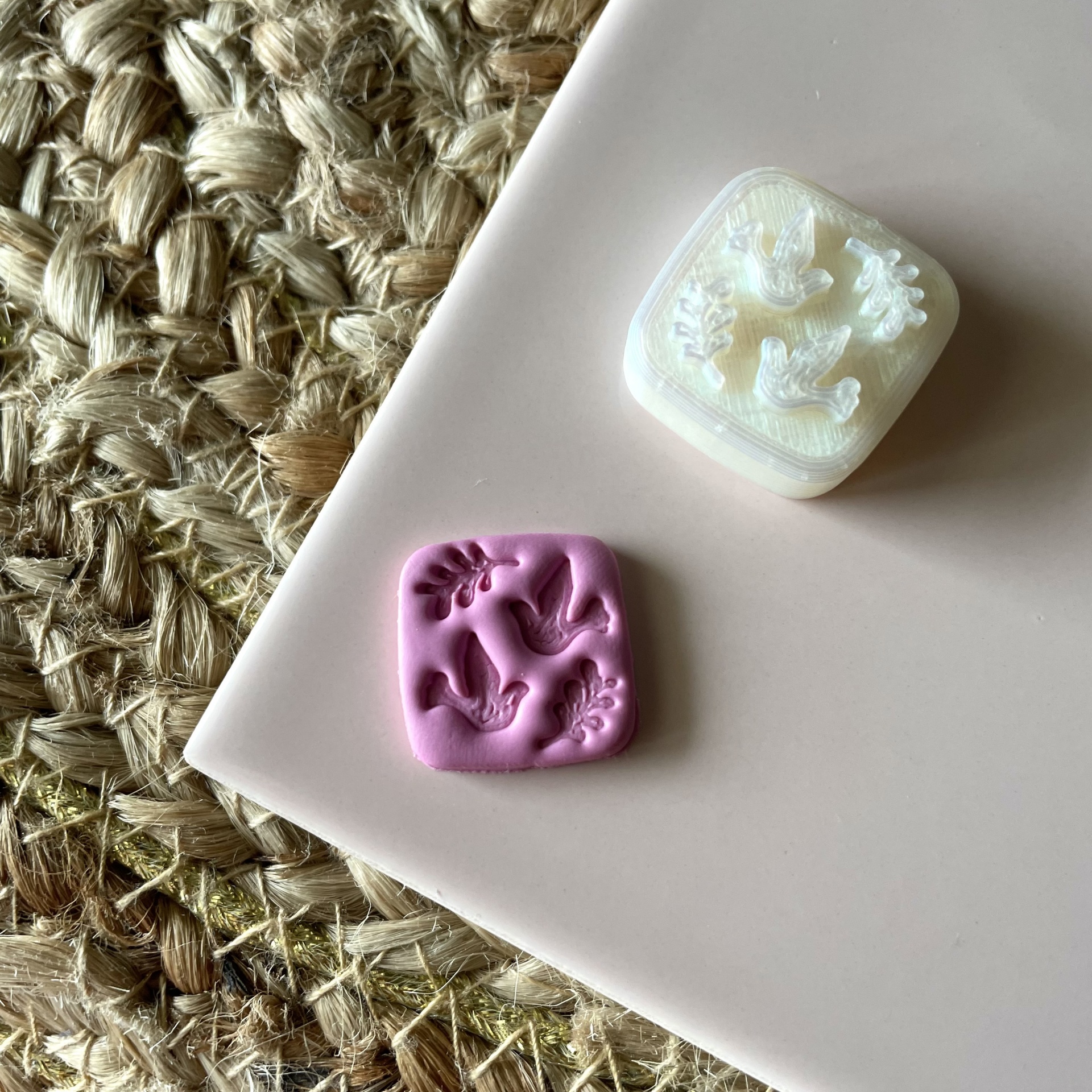 • Dois moldes quadrados branco e lilás com padrão de lagarto sobre superfície branca junto a tapete trançado bege