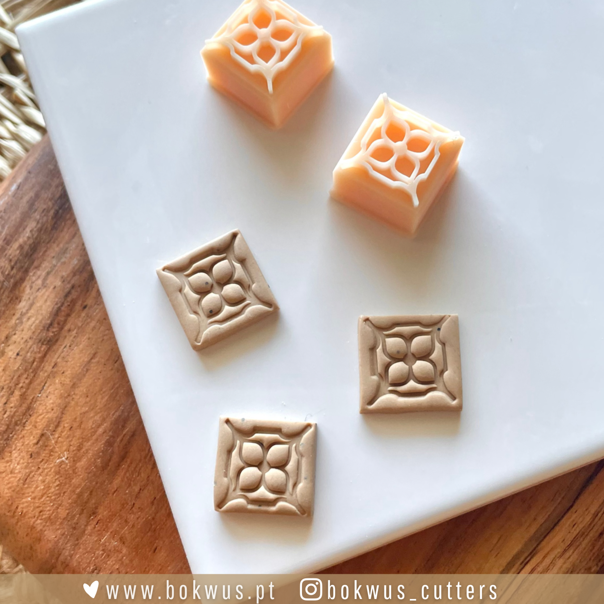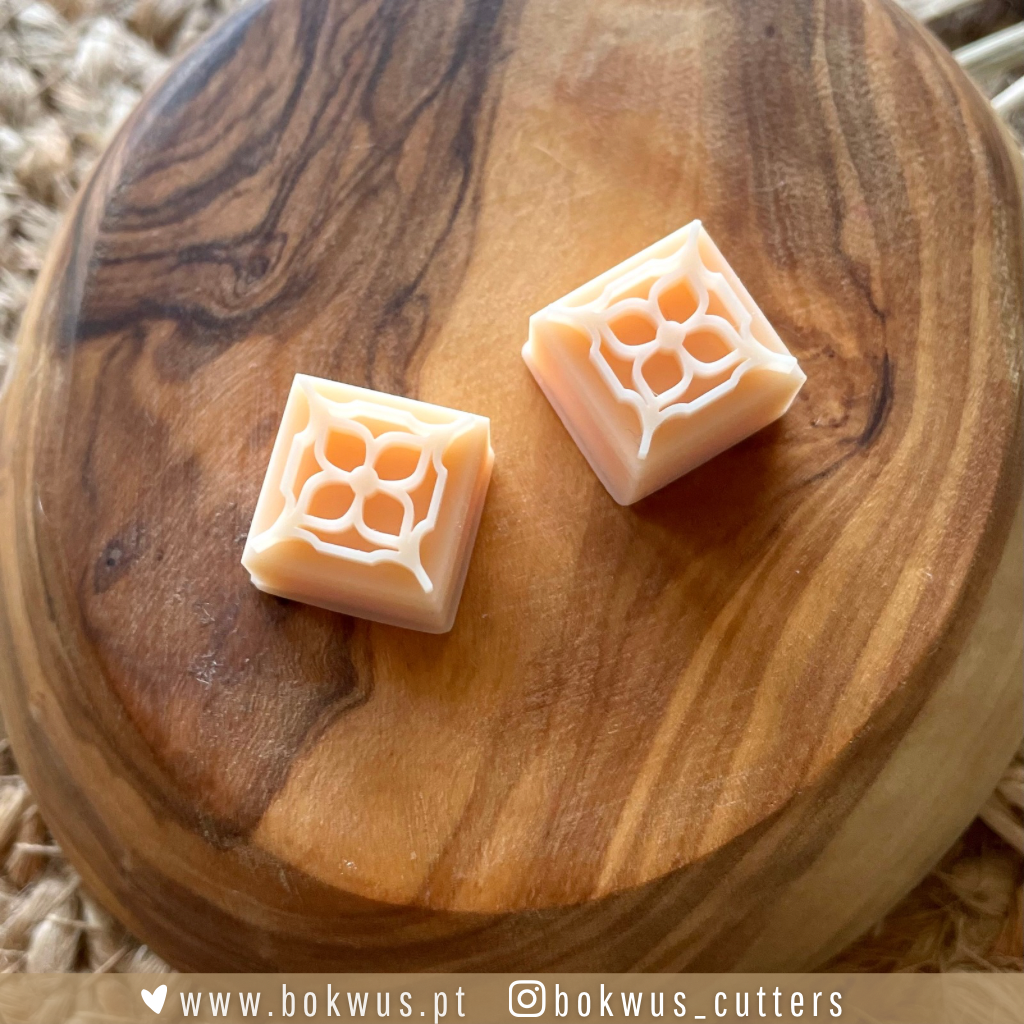 • Quatro cortantes quadrados para confeitaria com padrões em relevo sobre base branca e madeira