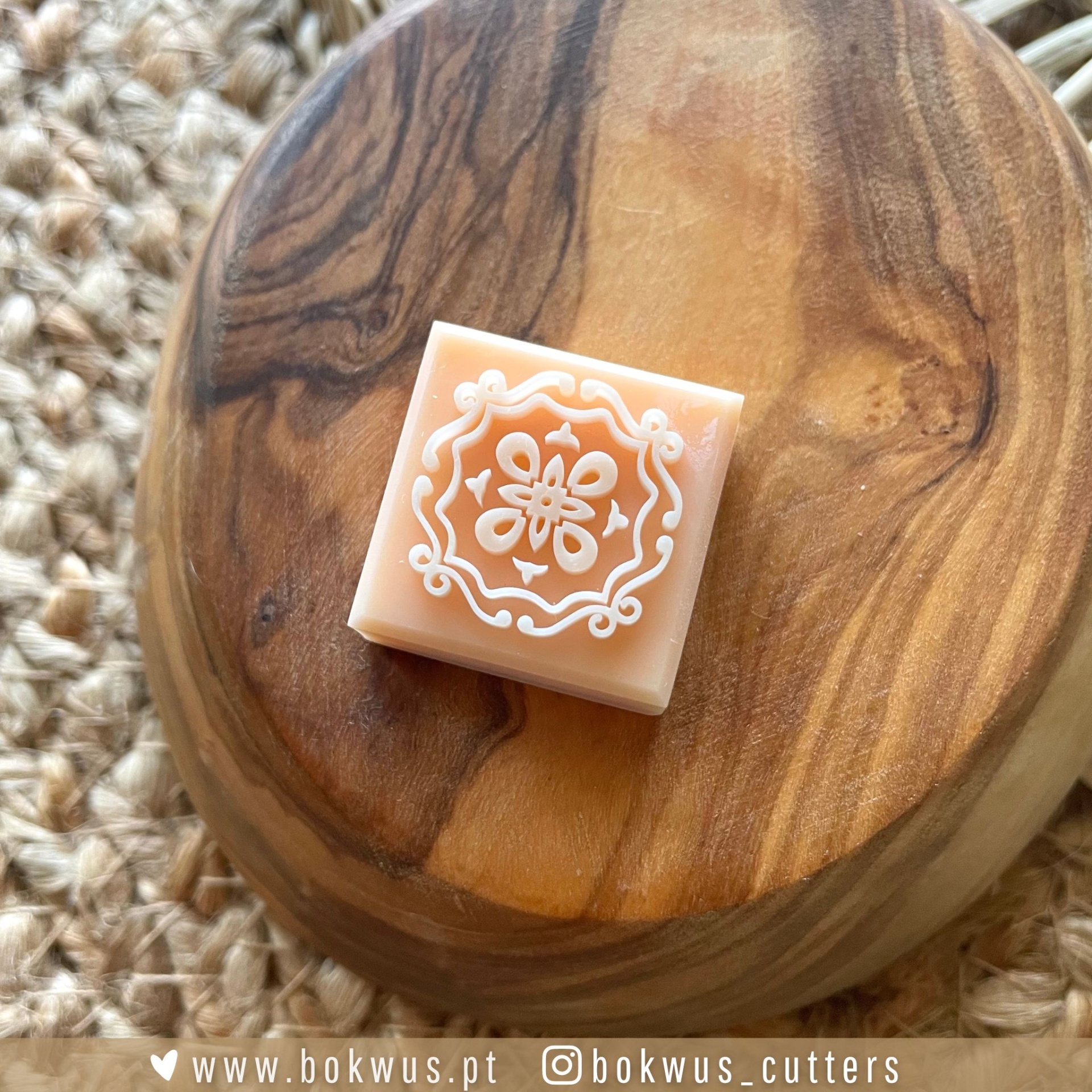 Molde de cortador quadrado com padrão floral branco sobre base de madeira oval e tecido de crochê