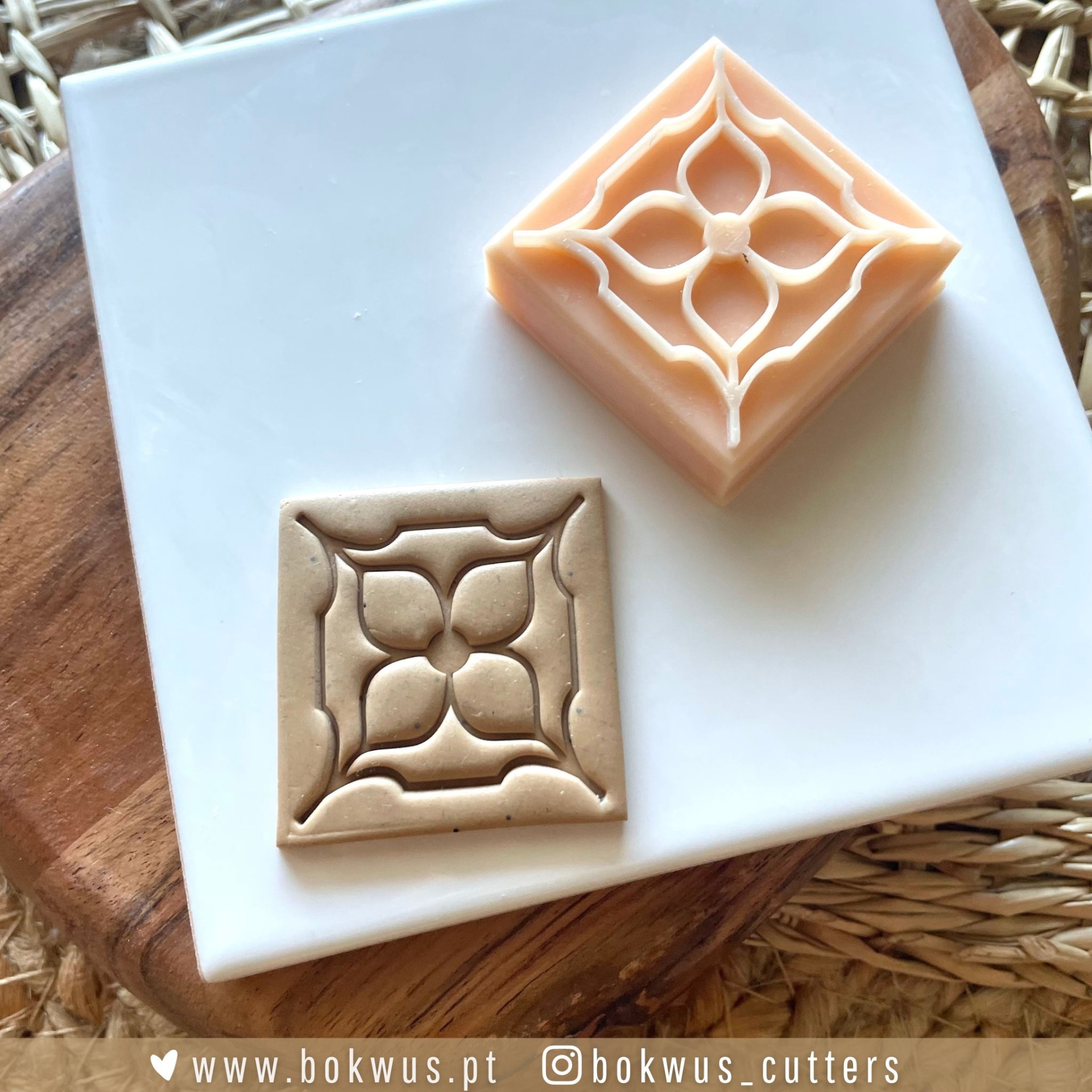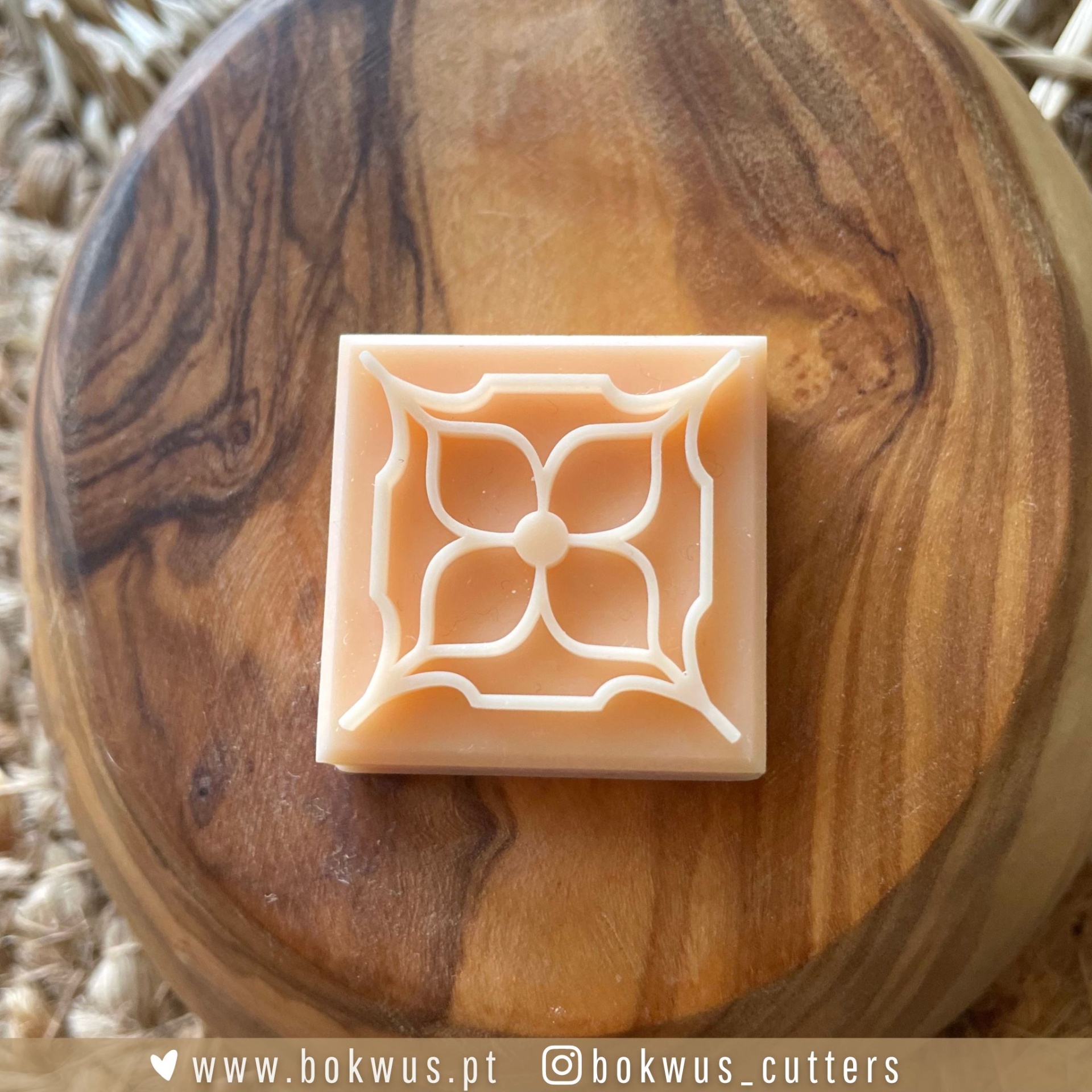 • Cortante quadrado de plástico com padrão floral em relevo sobre base de madeira