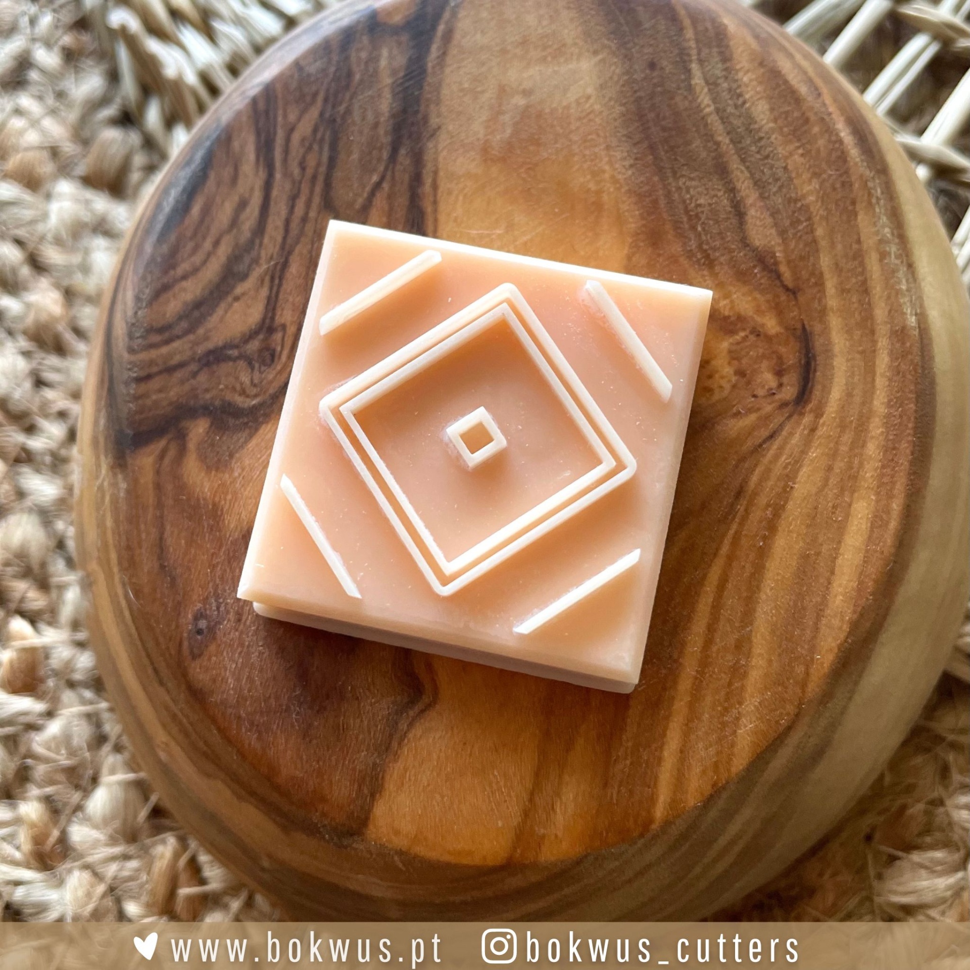 • Cortante quadrado de massa cor de pêssego com padrão geométrico em relevo sobre base de madeira redonda