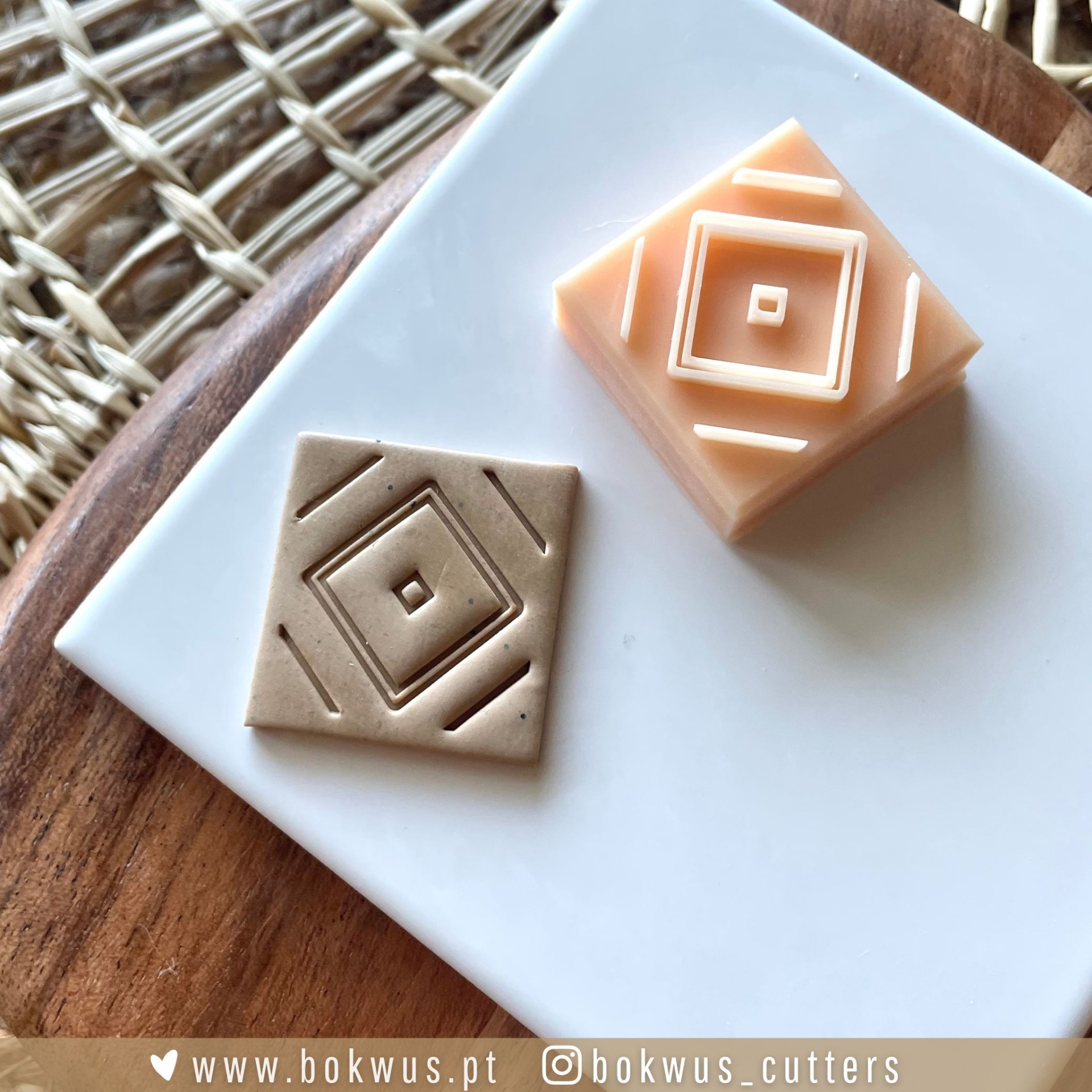 • Dois cortantes quadrados para bolachas com padrão geométrico, sobre base branca e madeira