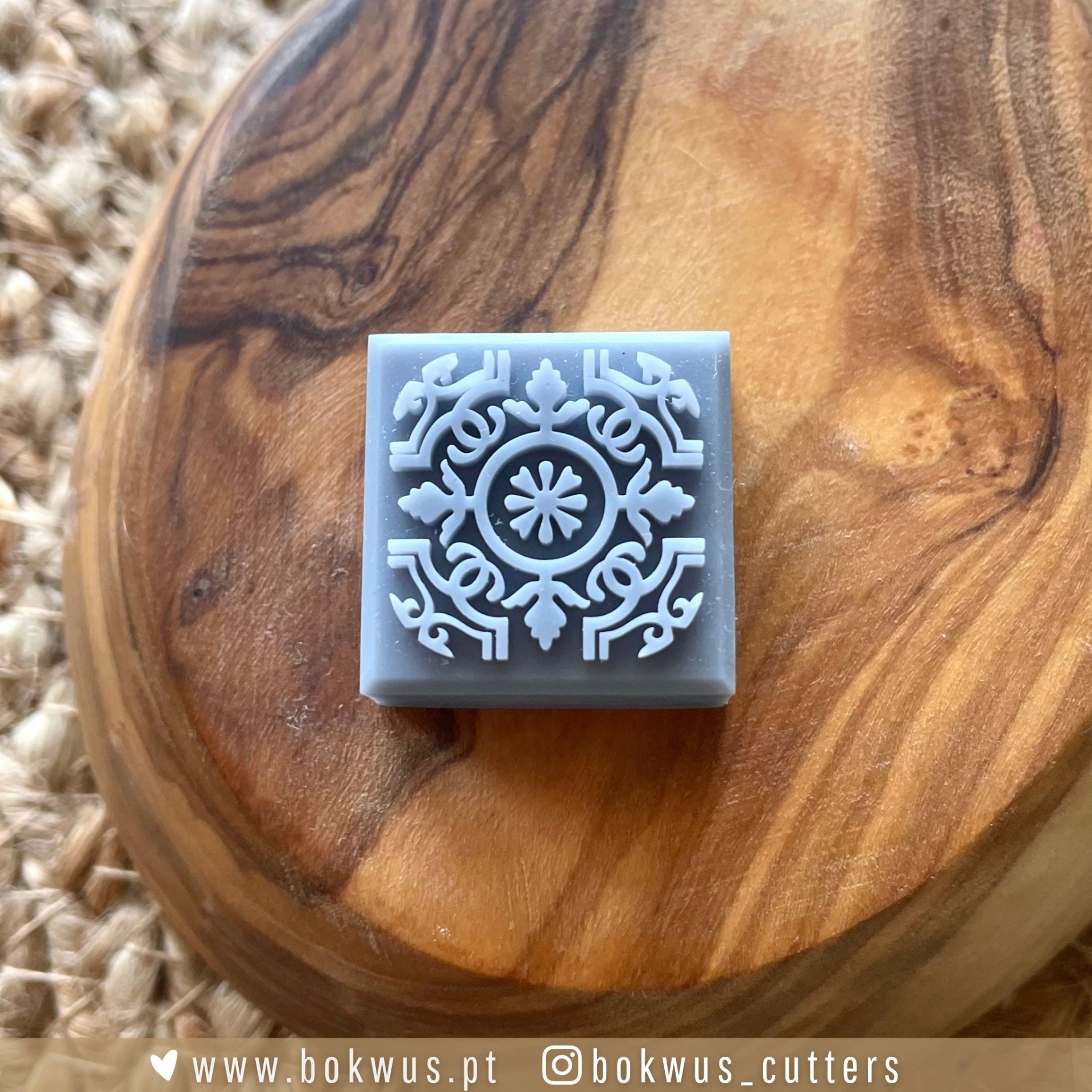 • Carimbo quadrado cinzento com padrão branco em relevo sobre base de madeira