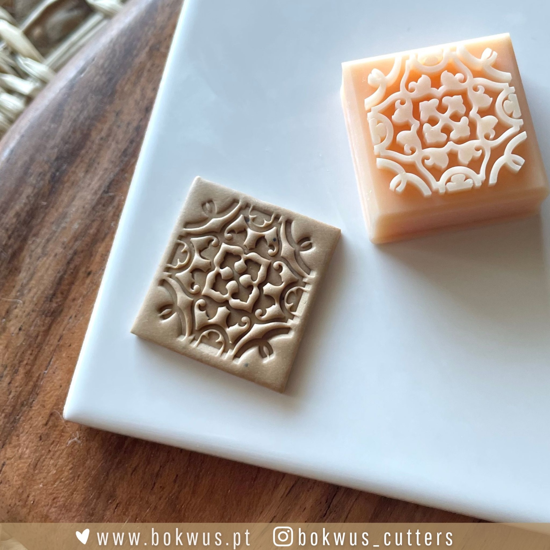 • Dois moldes quadrados decorativos com padrões florais intrincados, em cores castanha e bege, sobre superfície branca
