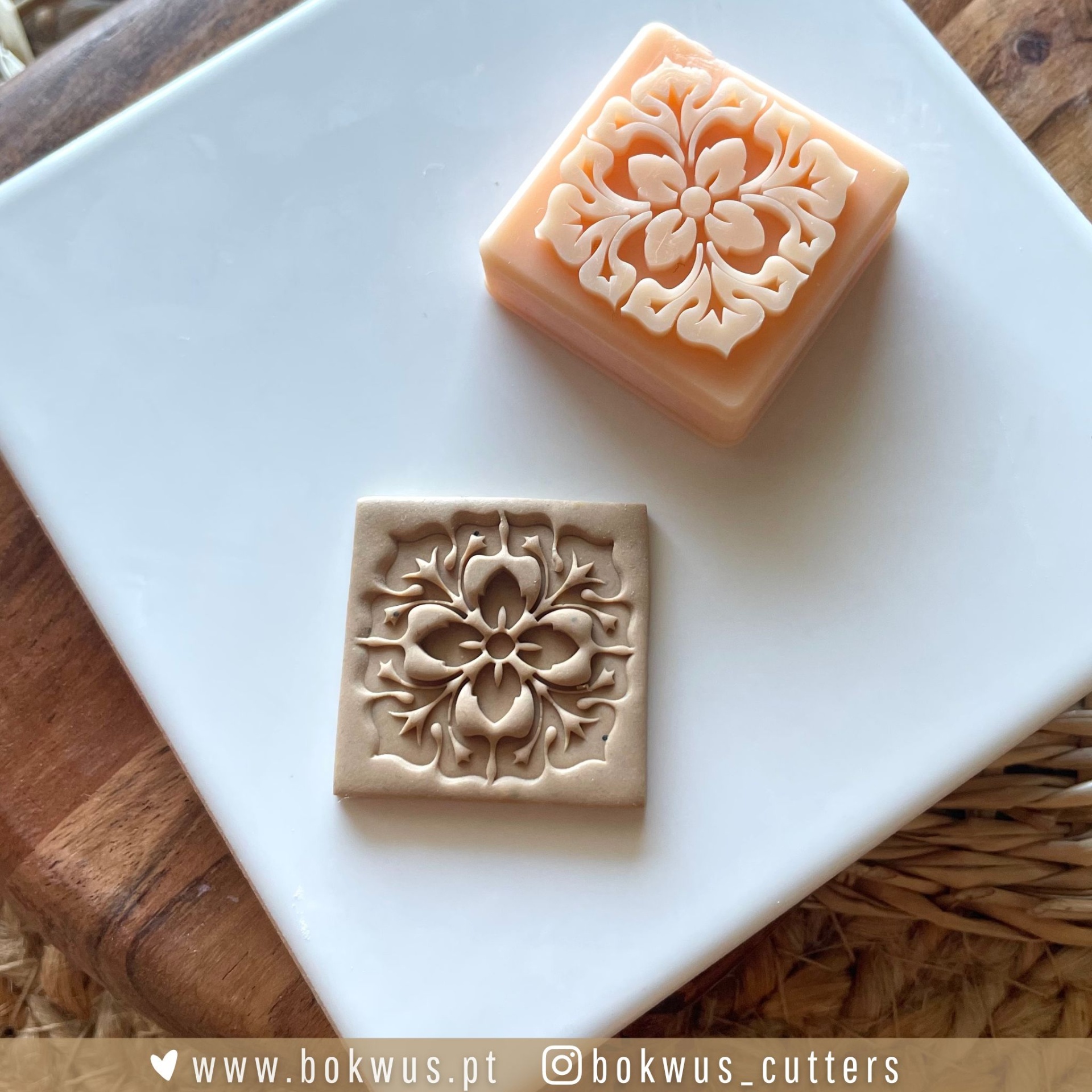 • Dois cortadores quadrados com padrão floral detalhado em superfícies branca e madeira