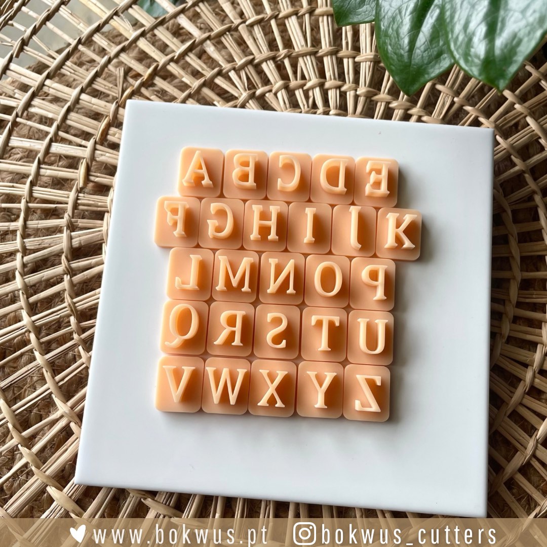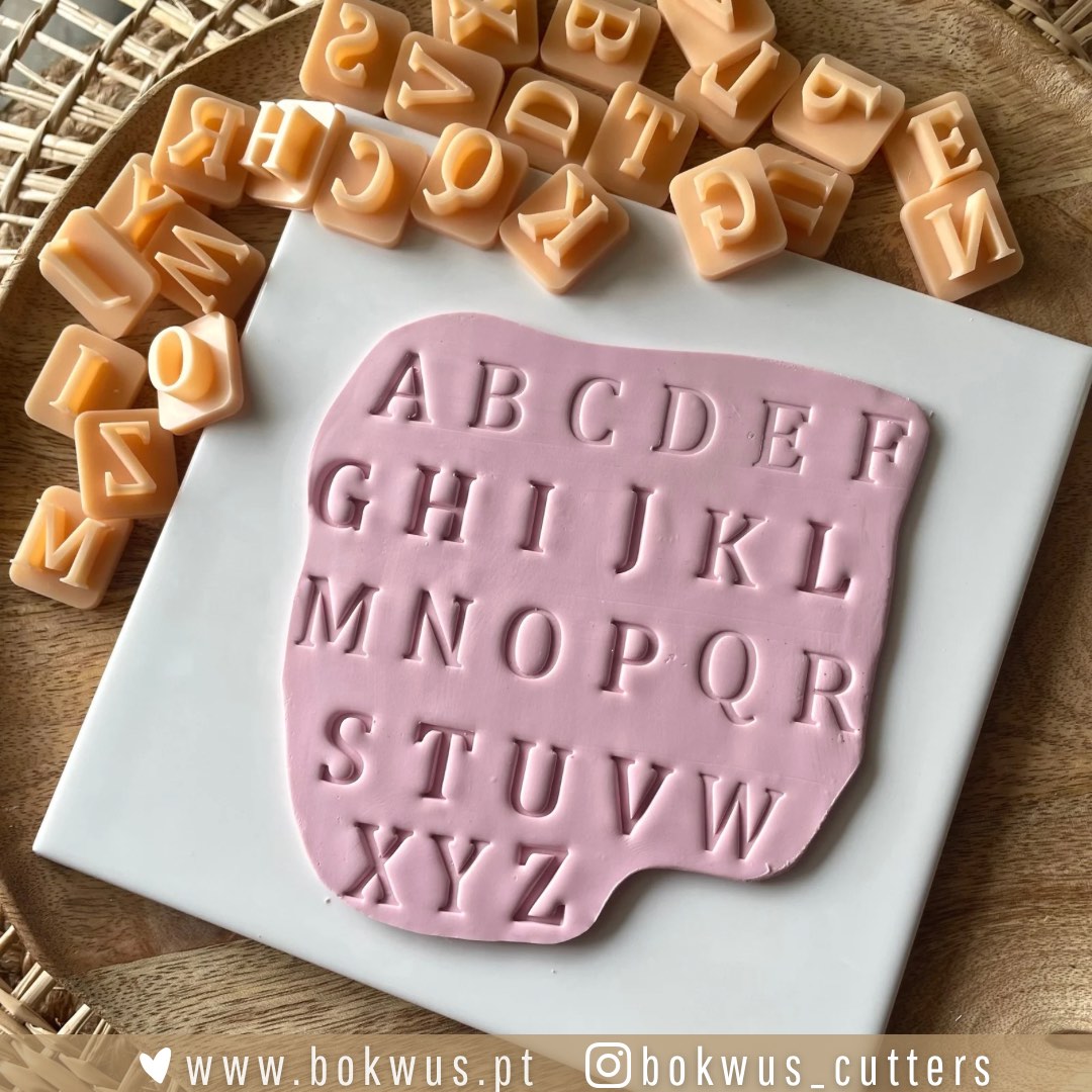 • Carimbos de silicone para letras maiúsculas em tom bege, com molde em silicone rosa e suporte branco sobre mesa de madeira.