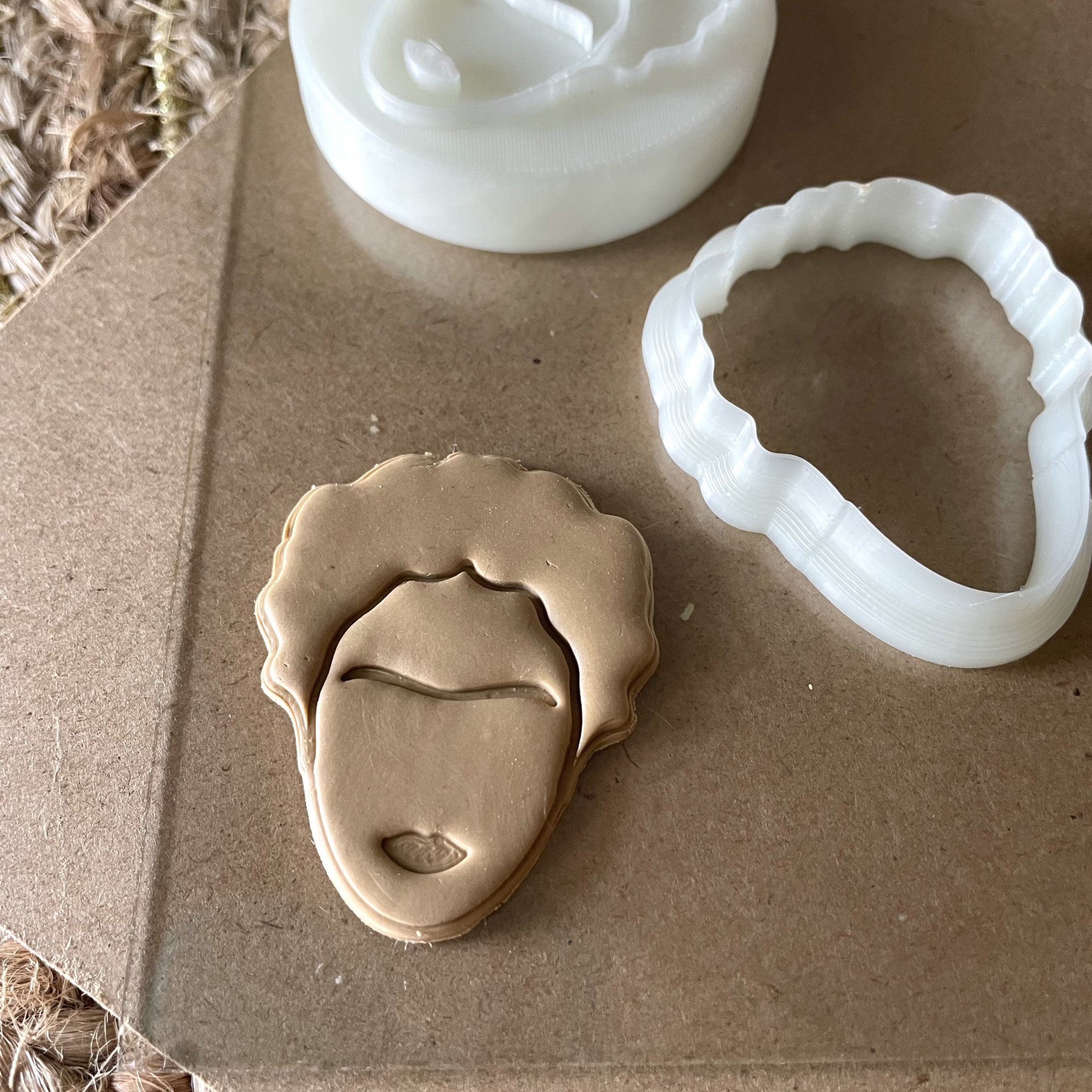 • Conjunto de cortador branco de plástico para massa e massa moldada em forma de rosto feminino sobre cartão.