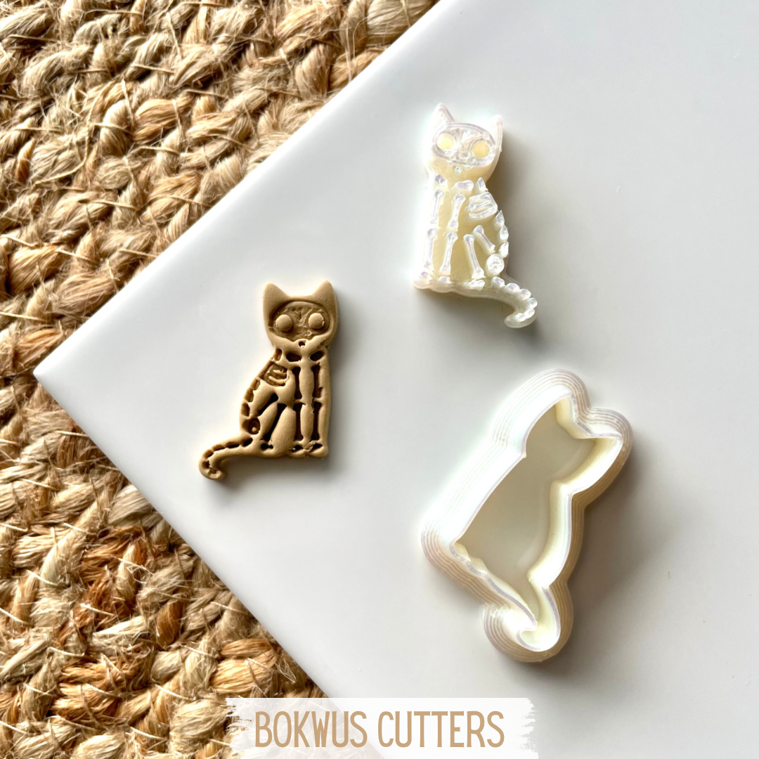 • Três cortadores de bolacha em forma de gato com padrão de esqueleto sobre superfície branca e tapete de fibra