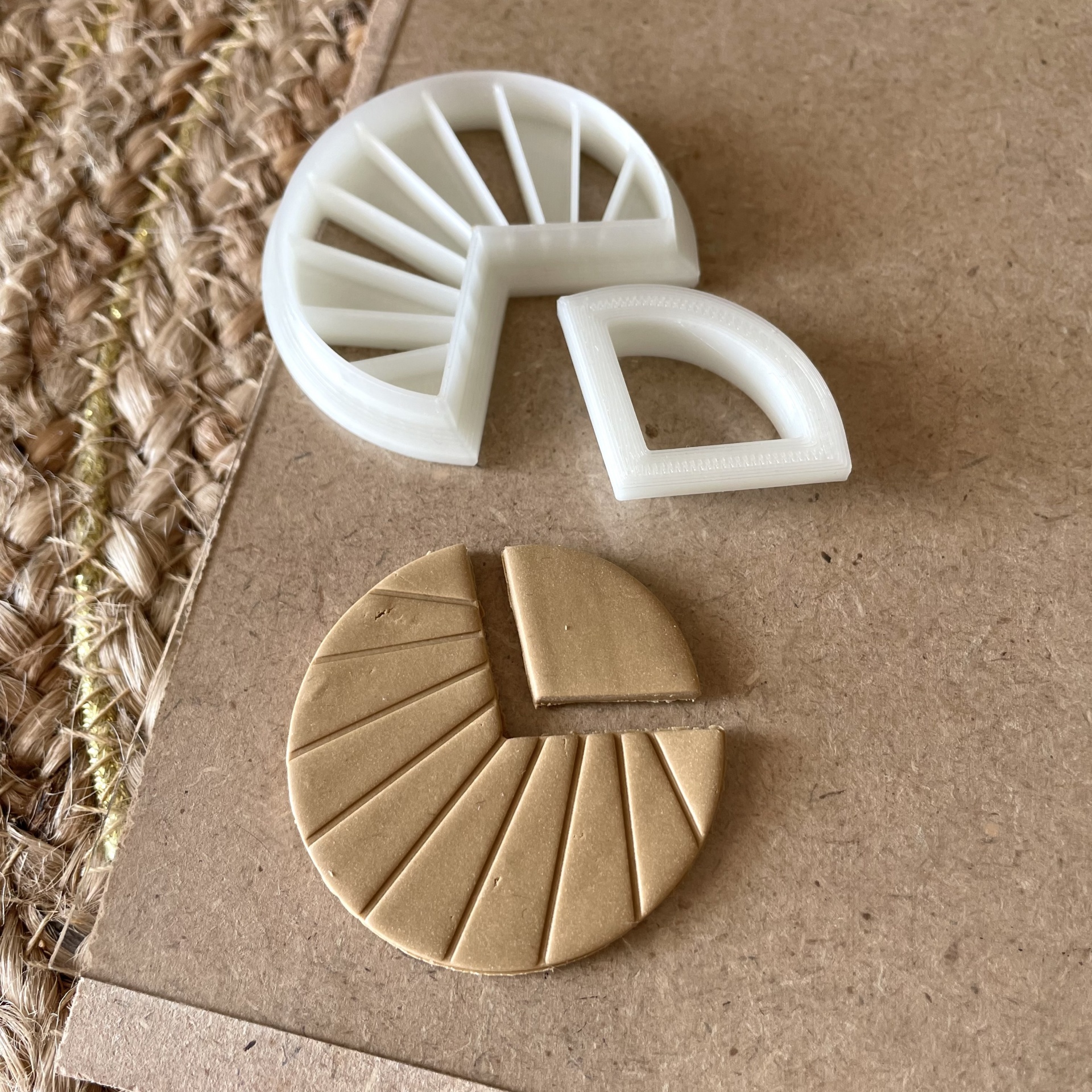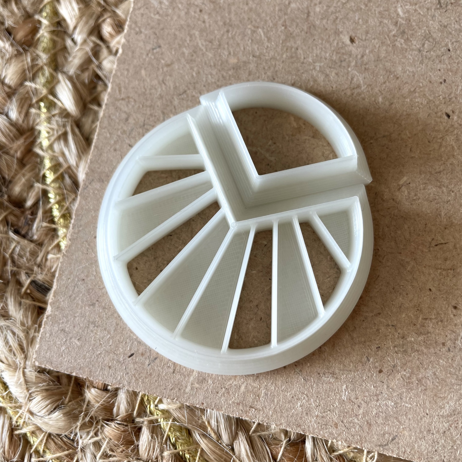 Molde branco de plástico e peça de argila dourada em forma de círculo dividido em fatias sobre cartão castanho