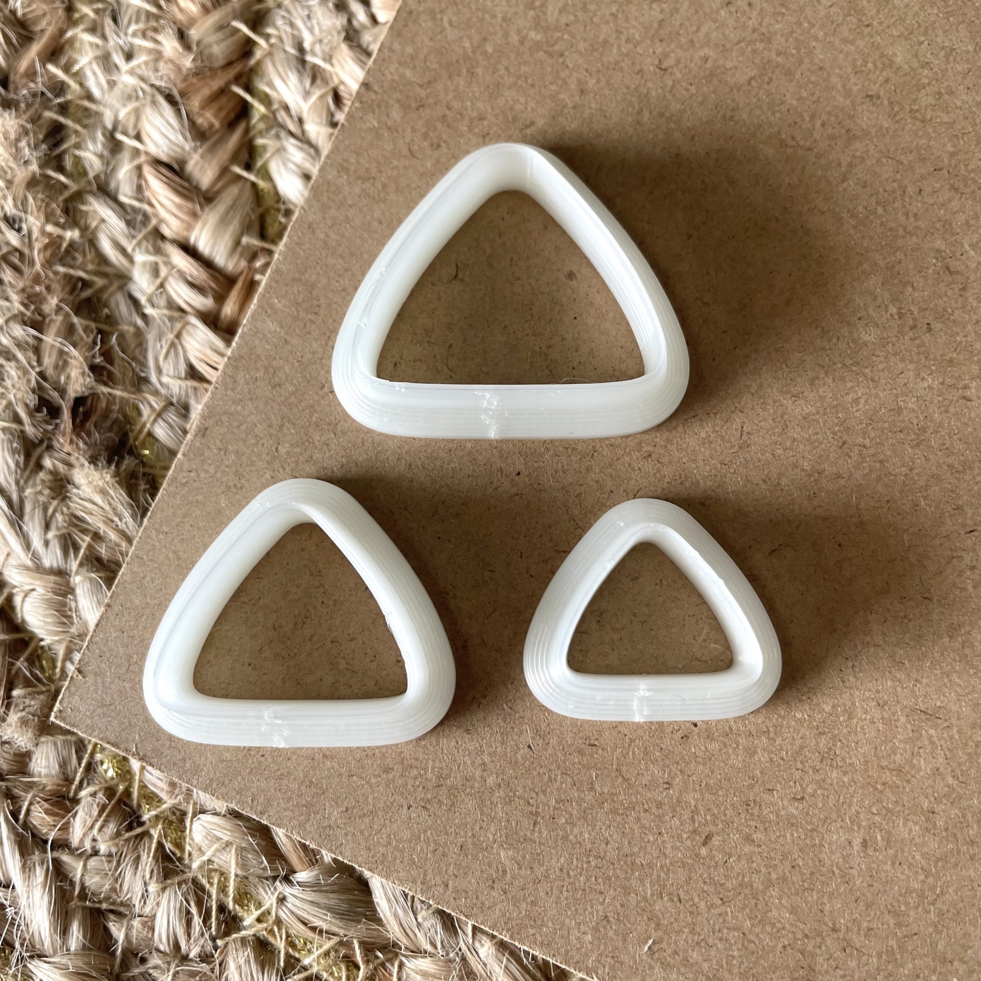 • Três argolas triangulares brancas de plástico em vários tamanhos sobre cartão castanho e tapete de fibras de juta.