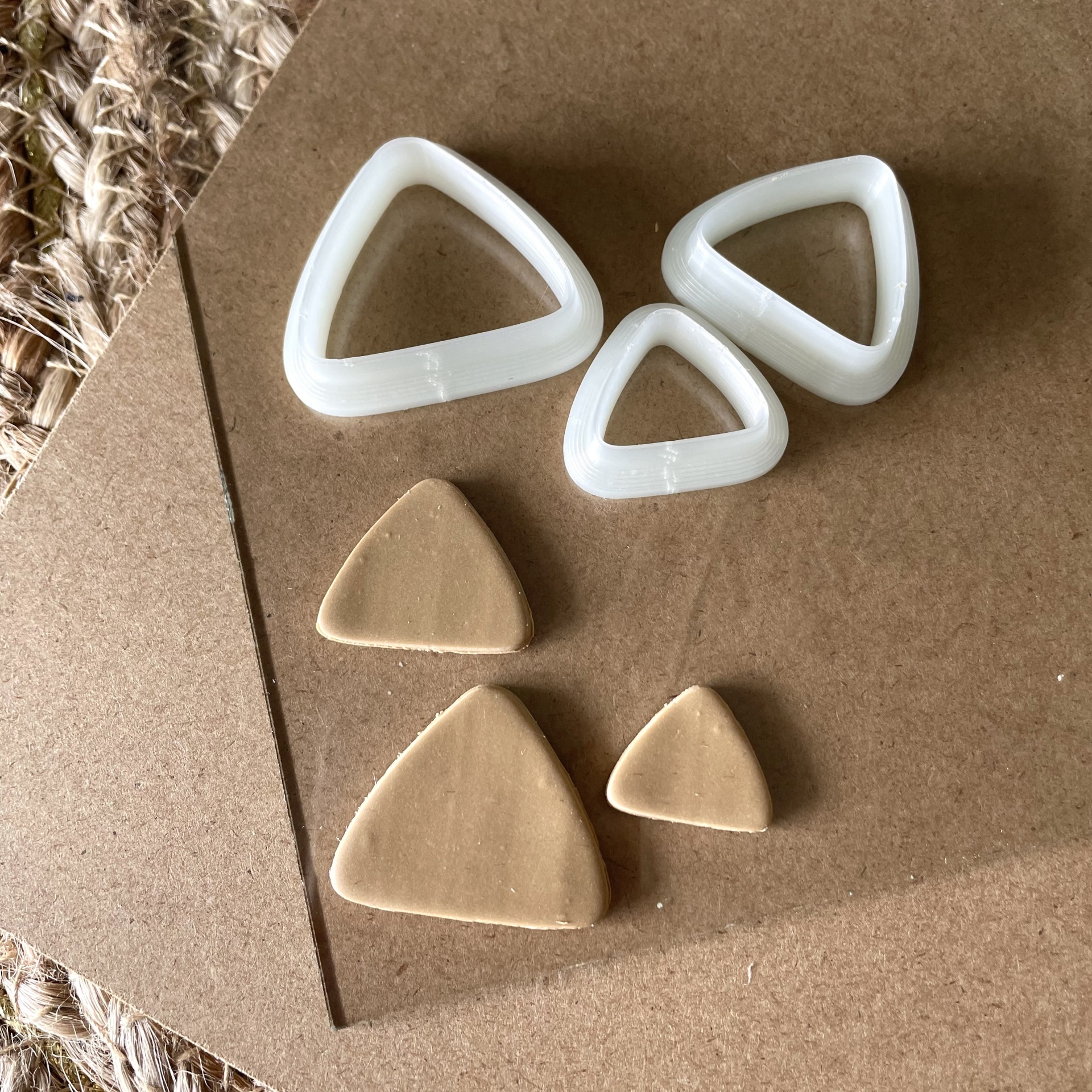 Cortadores triangulares brancos e pedaços de argila bege sobre papel castanho e tecido