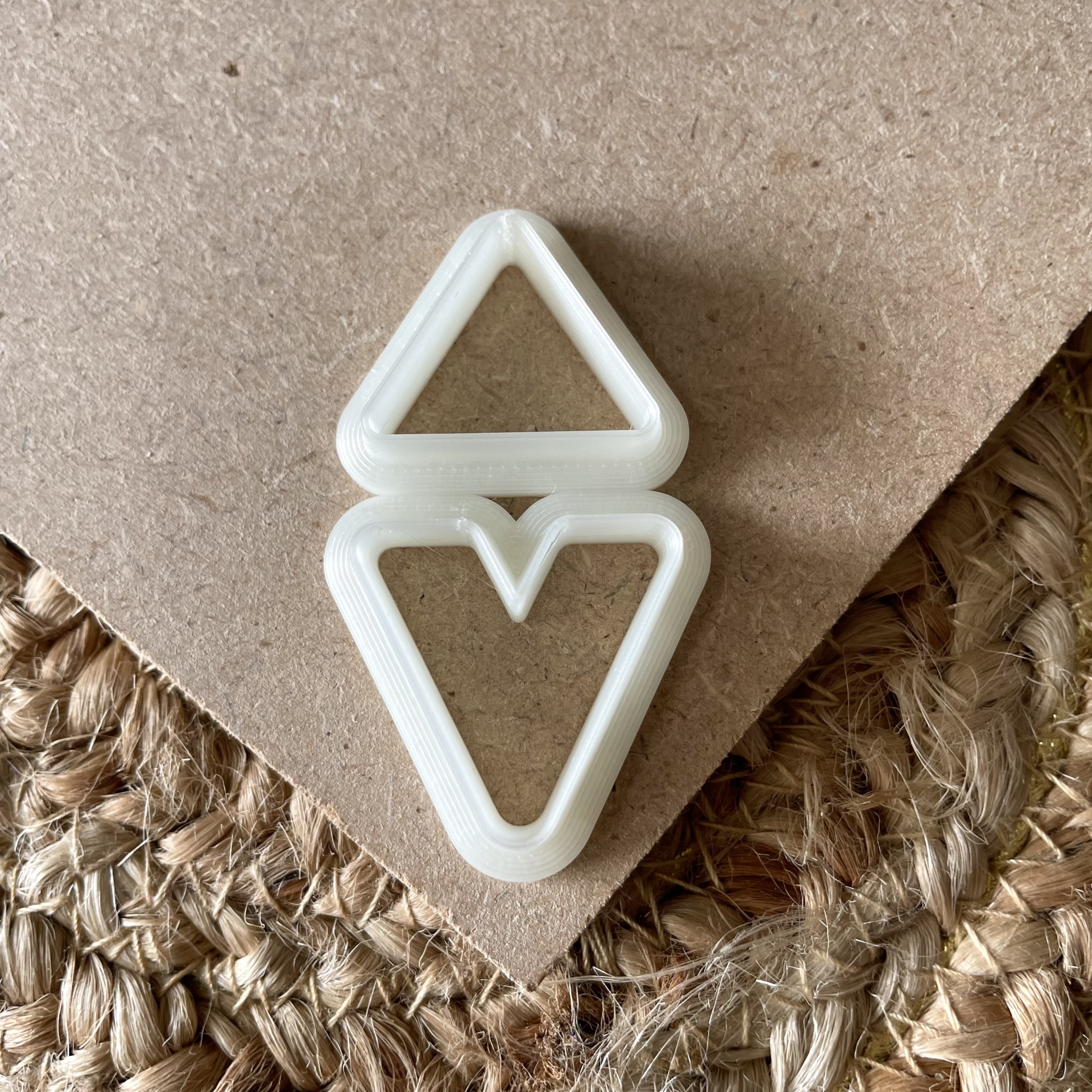 • Objeto de plástico branco em forma de triângulos sobre cartão e tapete de corda