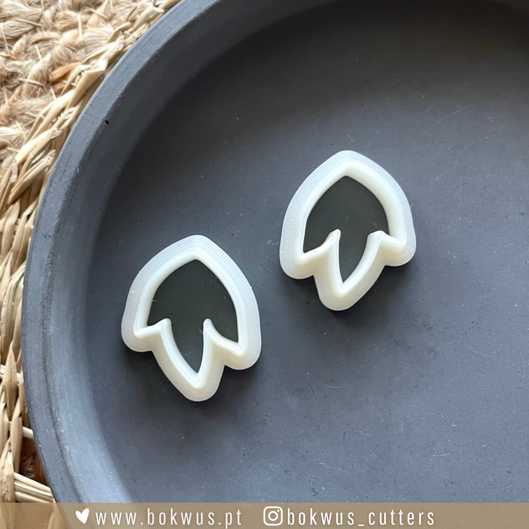 • Dois cortadores de massa brancos em forma de pétala de flor sobre prato preto redondo