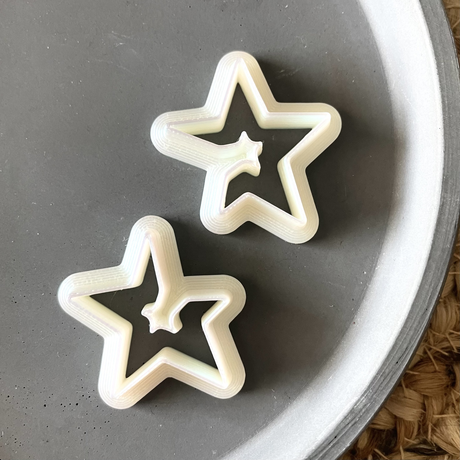 Brincos brancos em forma de estrela sobre prato cinza
