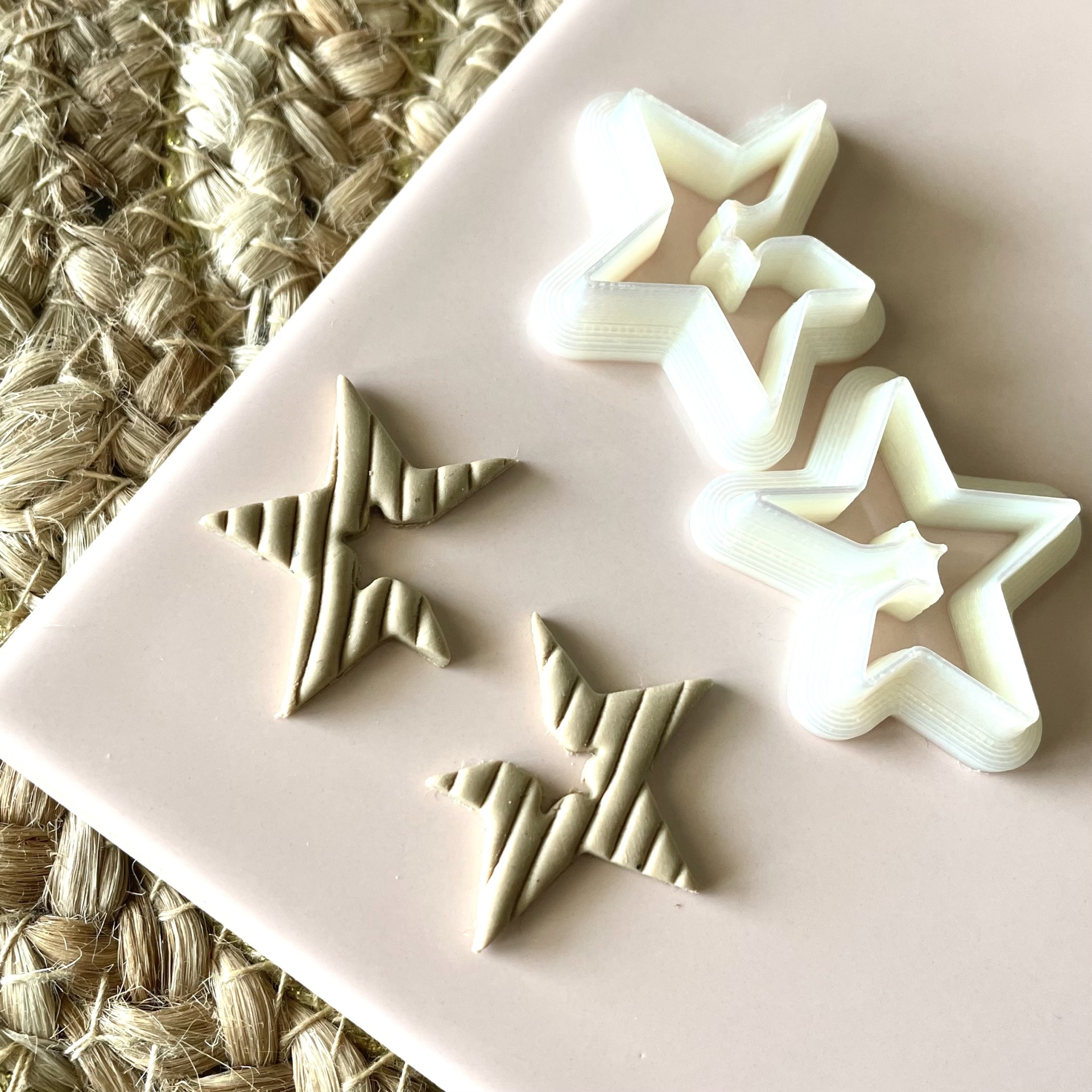 • Cortadores de biscoito em forma de estrela branca com biscoitos crús listrados e superfície bege claro