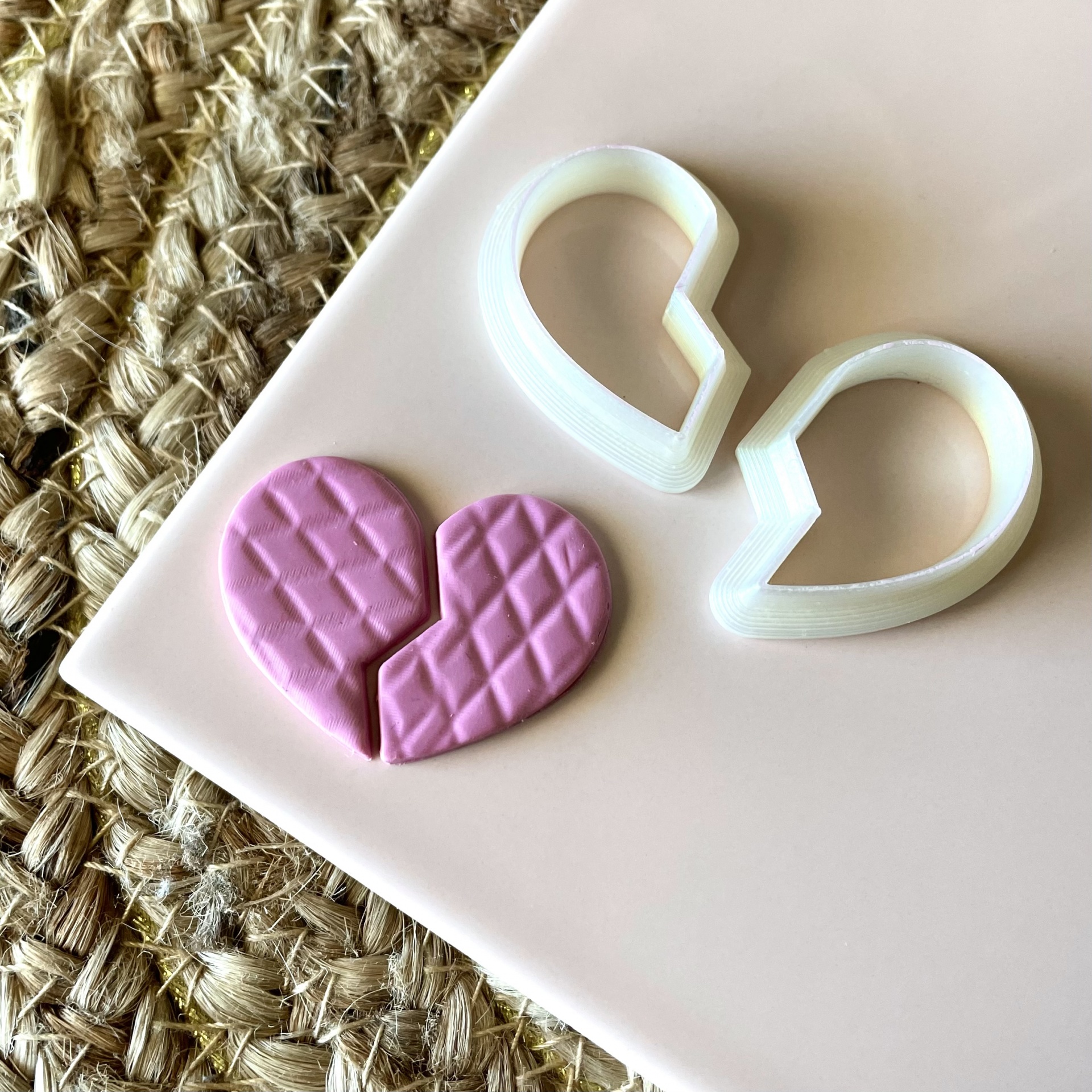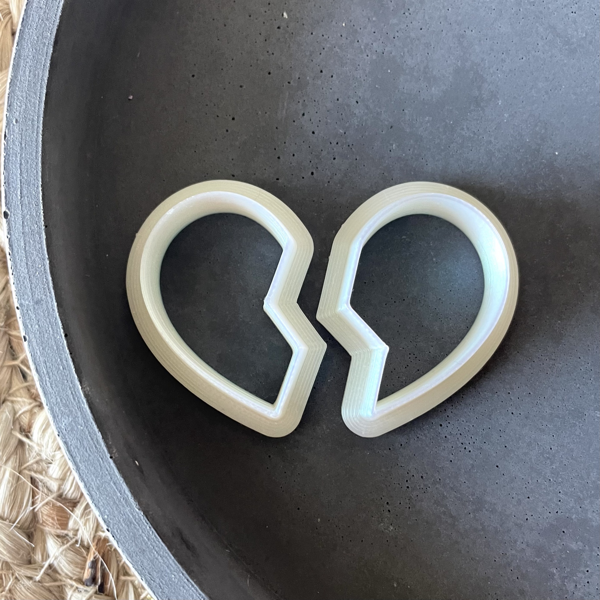 • Dois cortadores de biscoitos em forma de coração partido em tabuleiro cinza.