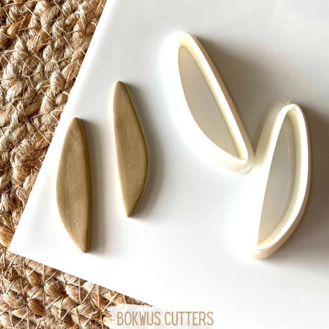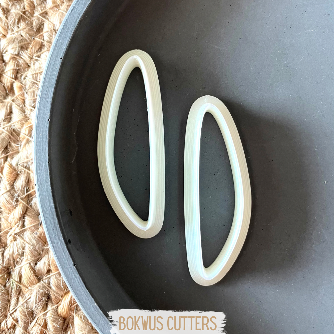 • Dois cortadores de plástico branco em forma de meia-lua sobre superfície preta e etiqueta 'BOKWUS CUTTERS'