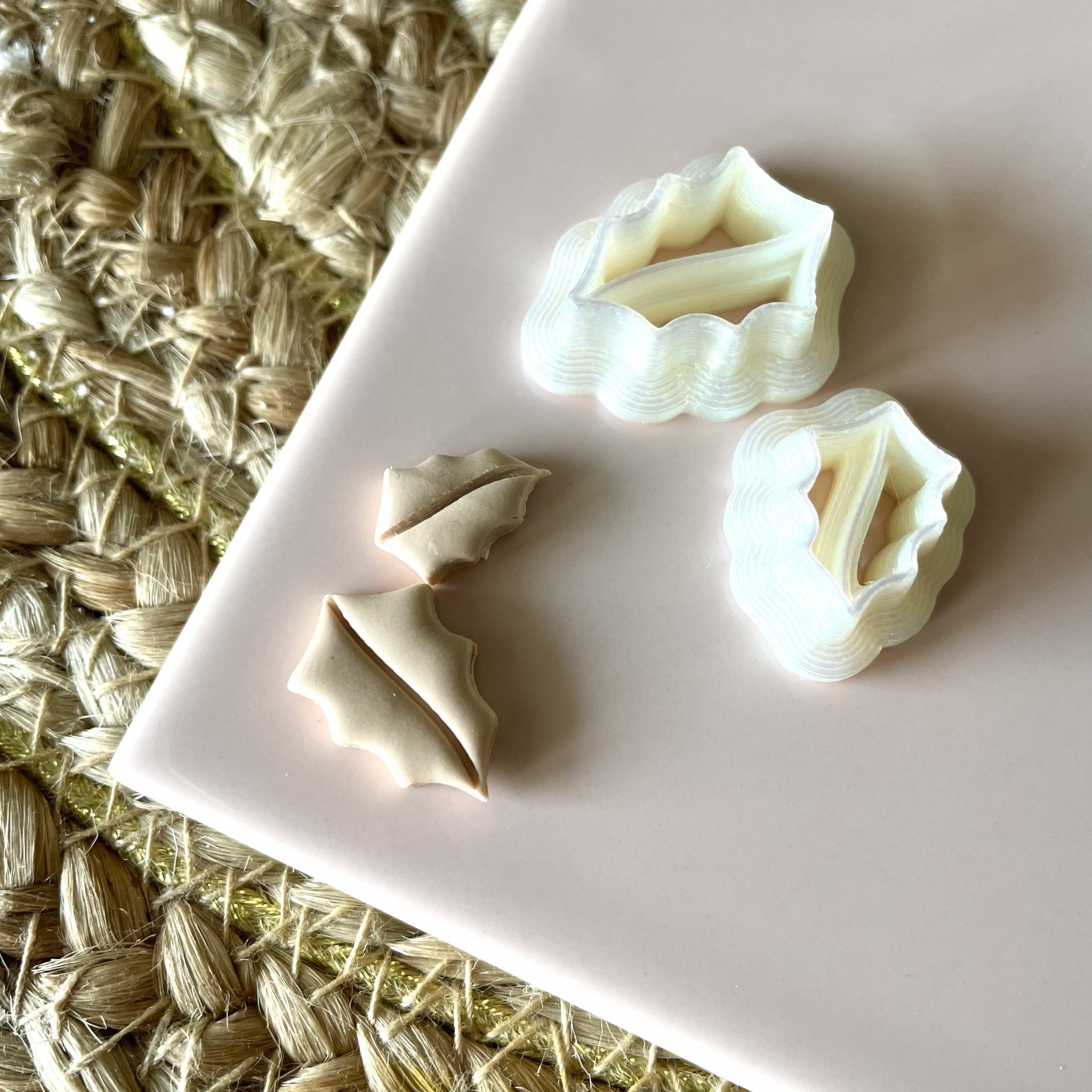 • Cortadores de massa em forma de folhas e peças de massa sobre superfície rosa clara e esteira de fibra natural