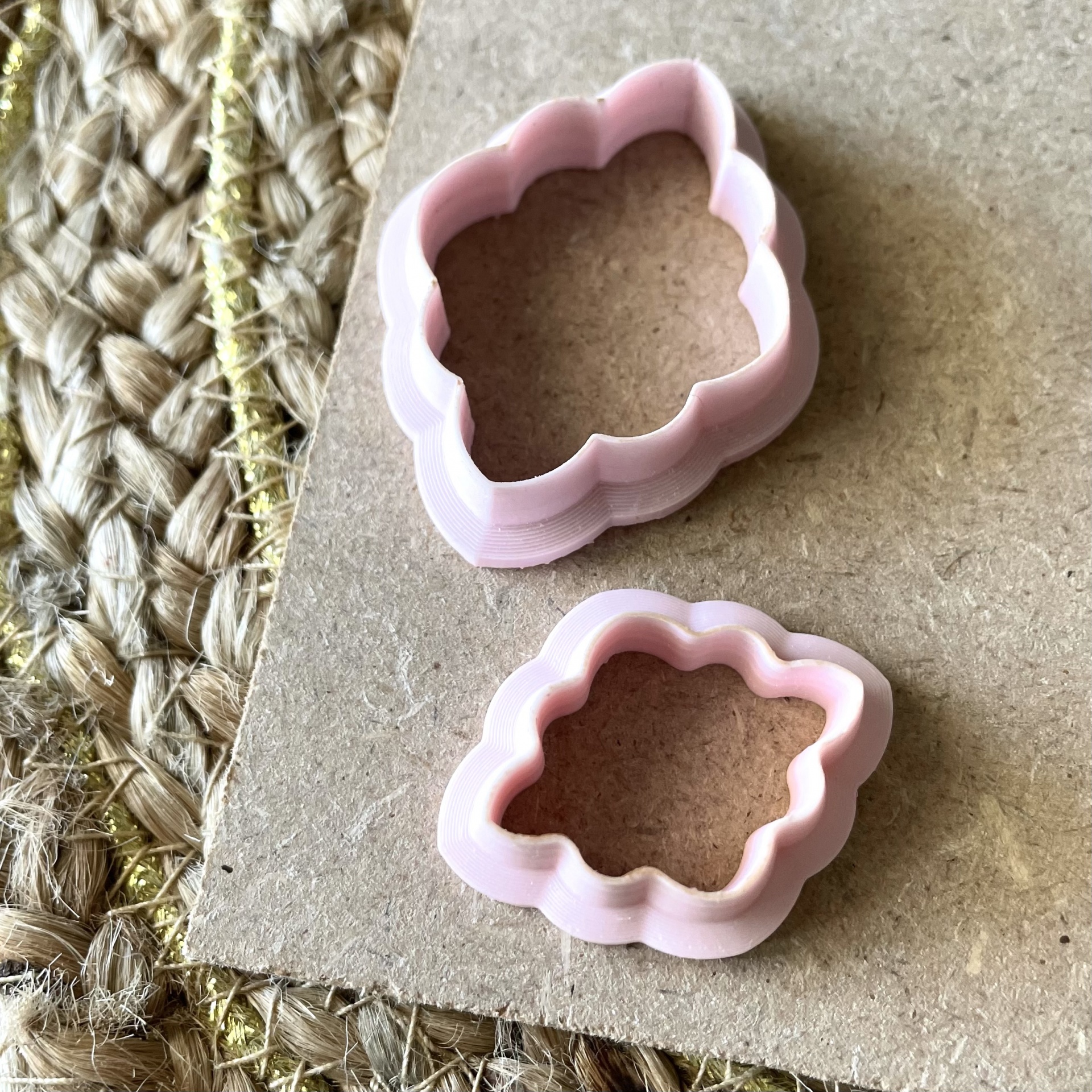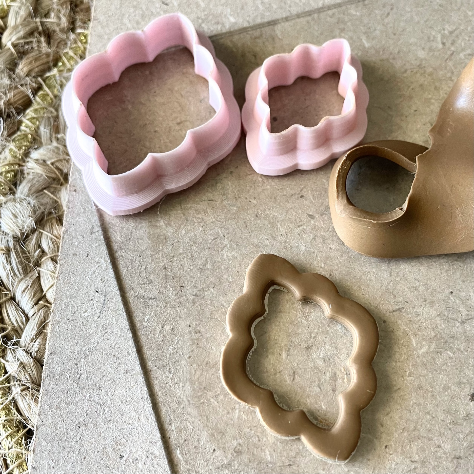 • Três cortadores de massa cor-de-rosa e marrom em formato de flor sobre superfície cinzenta e tapete de fibras