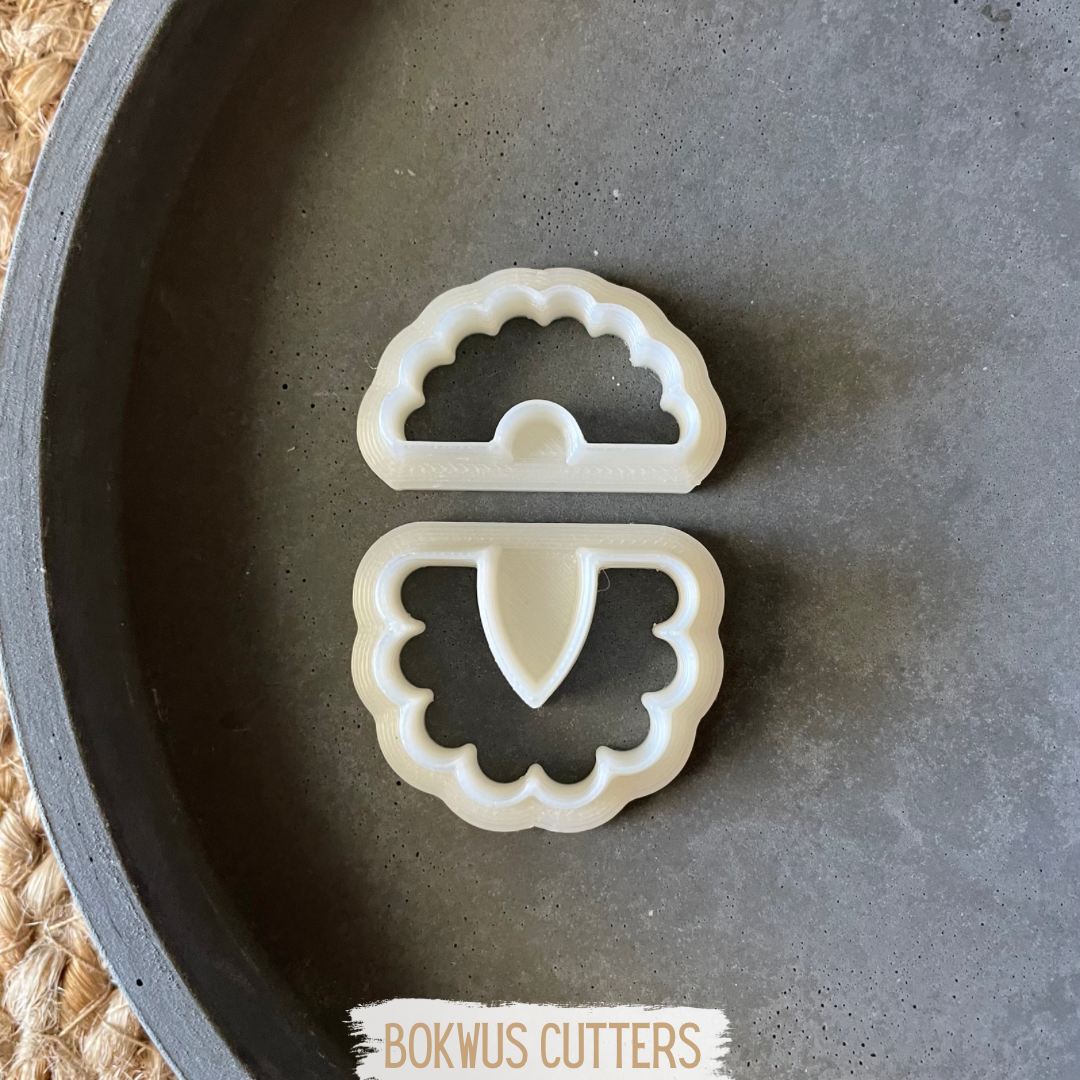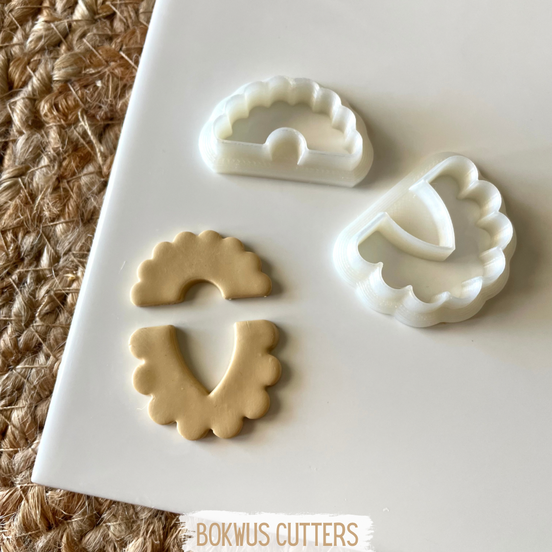 • Cortadores de massa brancos e massa beige em superfície branca com fundo de fibra natural e texto BOKWUS CUTTERS
