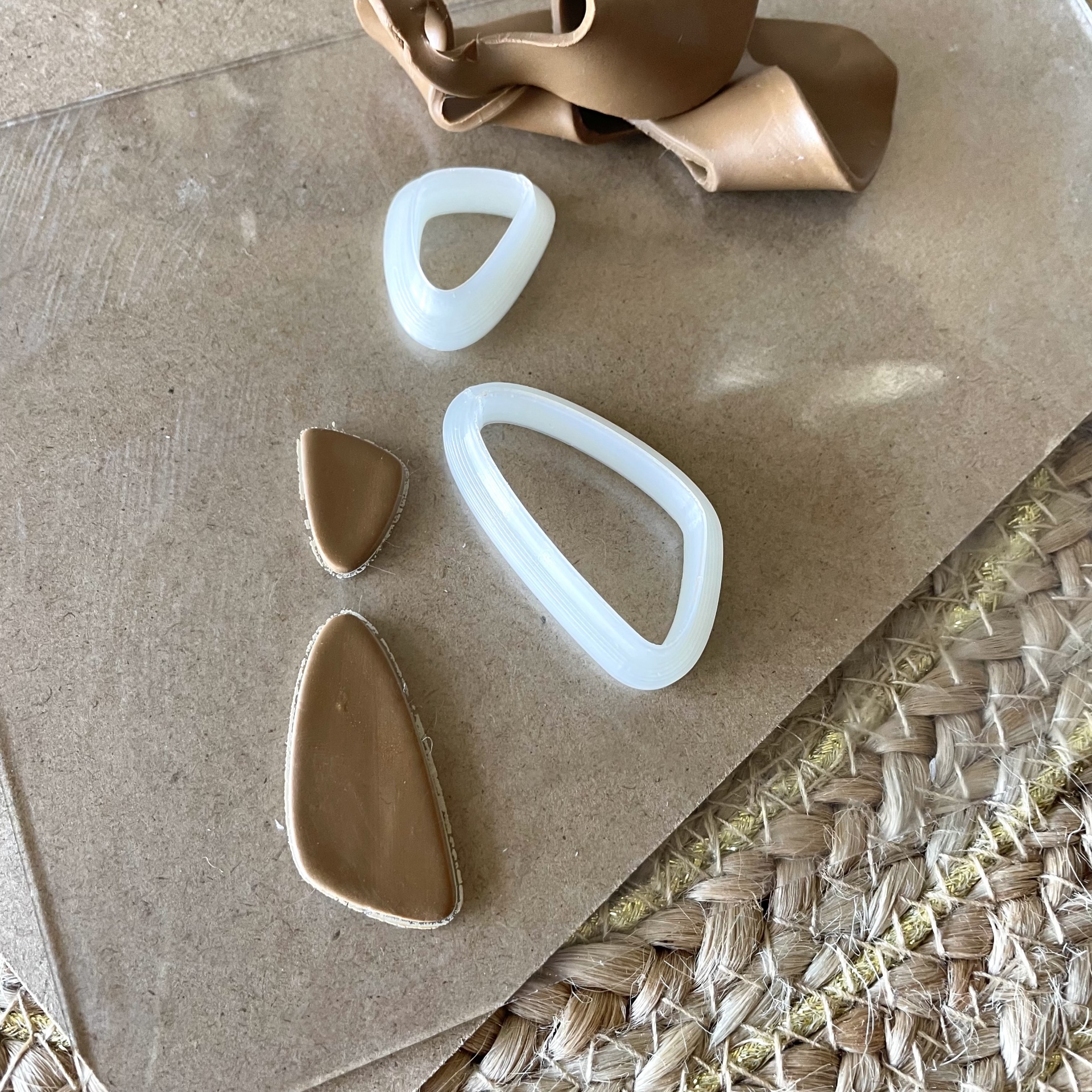 • Brincos assimétricos bege e branco sobre superfície castanha textil com tira de couro.
