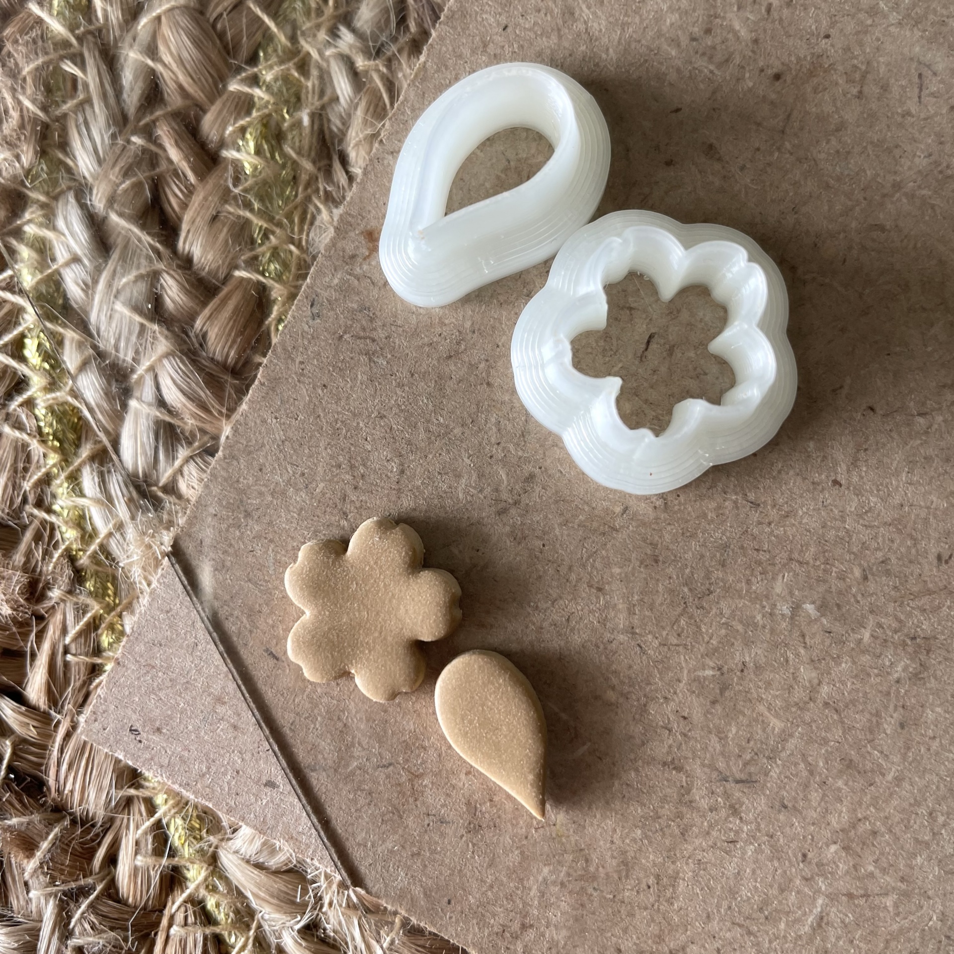• Cortadores de massa de plástico branco e peças de massa cortada sobre cartão castanho e tapete de fibras naturais