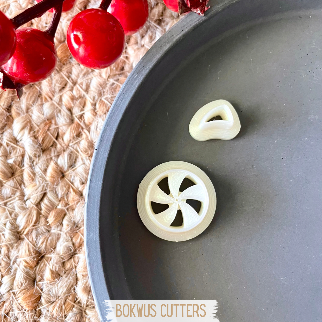 • Conjunto de cortadores redondos com padrão pinwheel em superfície branca e tapete natural
