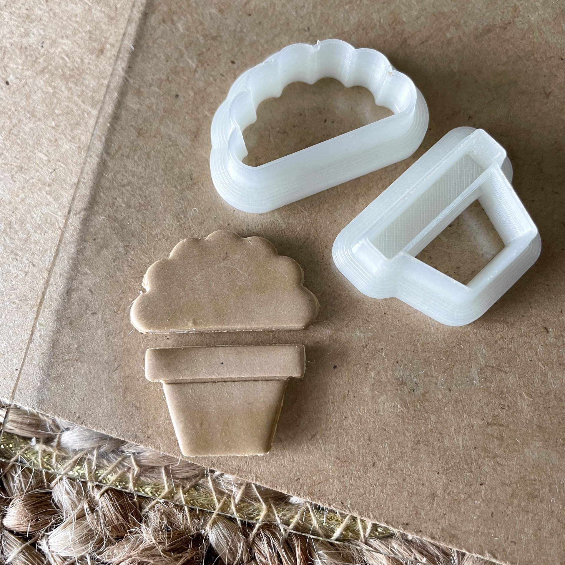 Cortador de bolachas em forma de vaso de plantas branco sobre cartão castanho