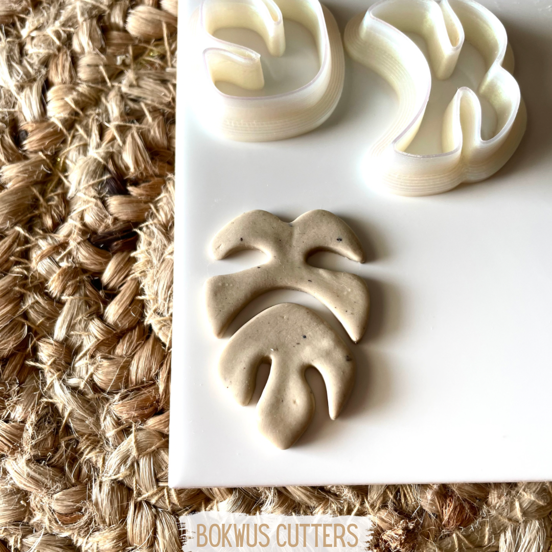 • Cortantes de massa em formato de folha Monstera com massa modelada ao lado e fundo de tecido trançado