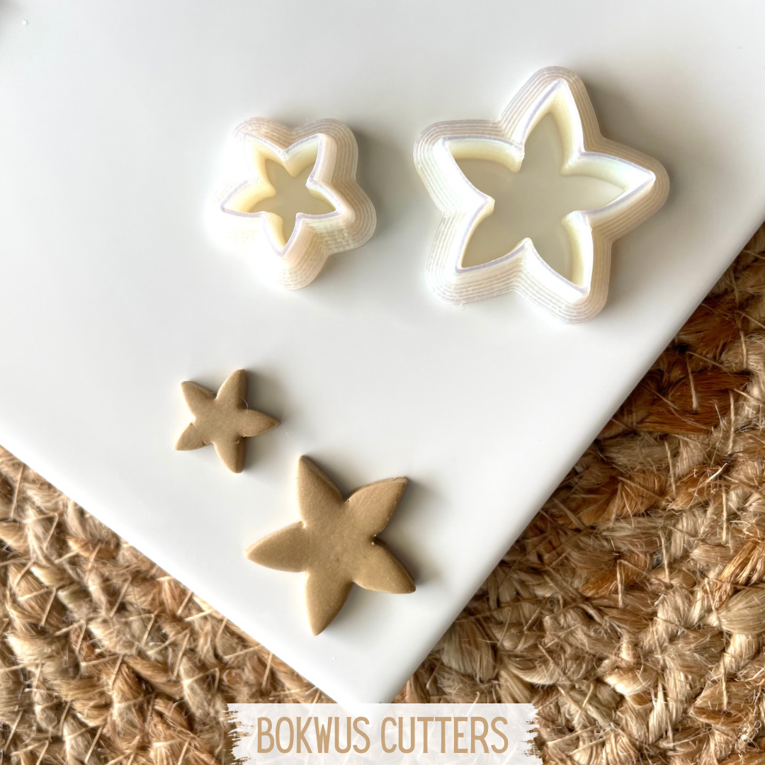 • Formas cortantes de massa em forma de flor com cinco pontas, massa cortada e texto BOKWUS CUTTERS