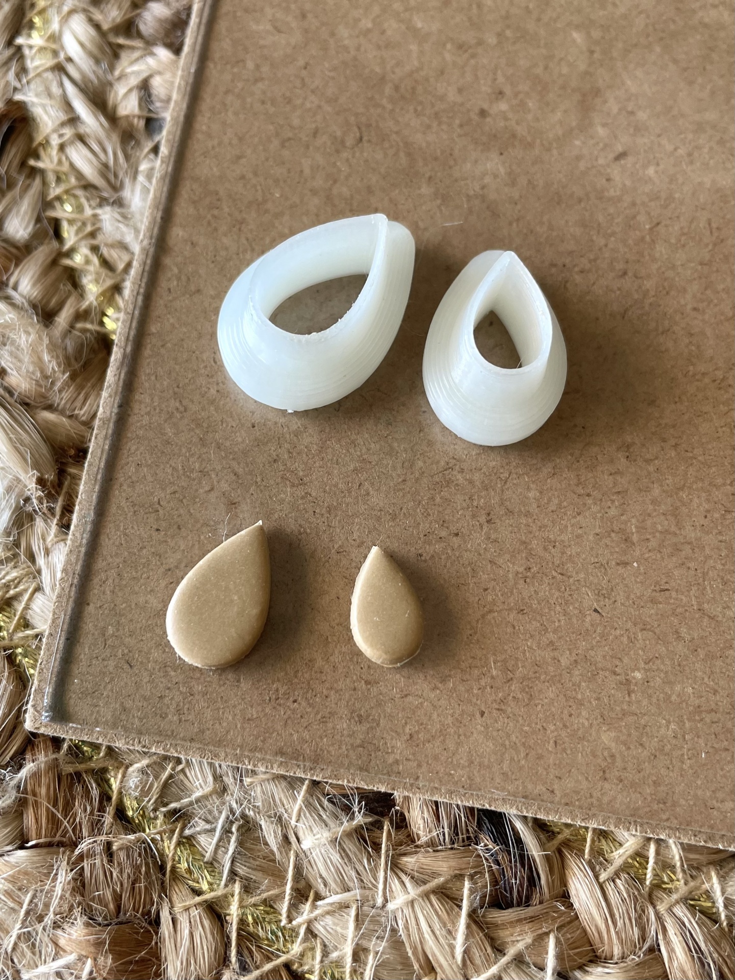 Quatro peças em forma de gota brancas e douradas sobre cartão e tapete de fibras naturais