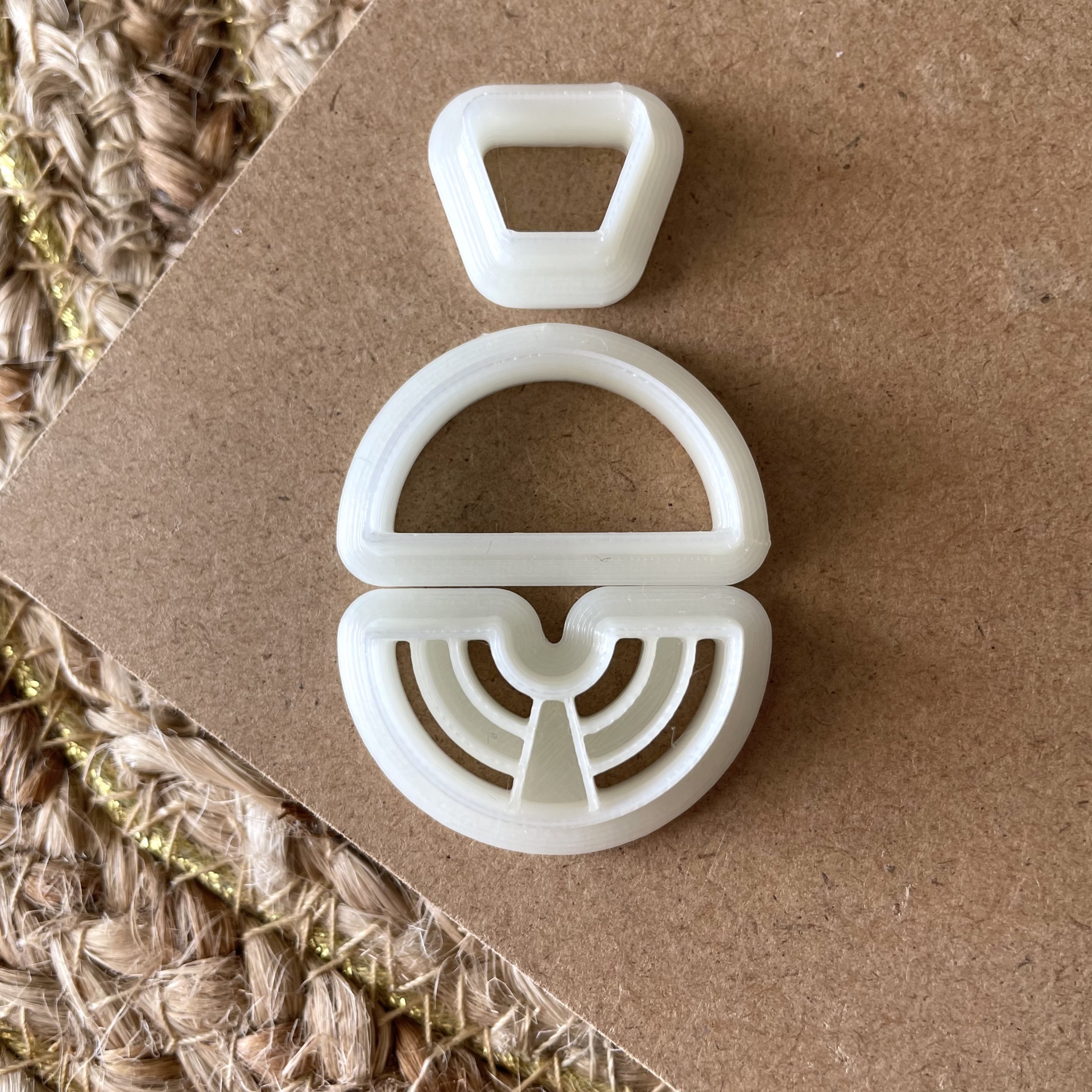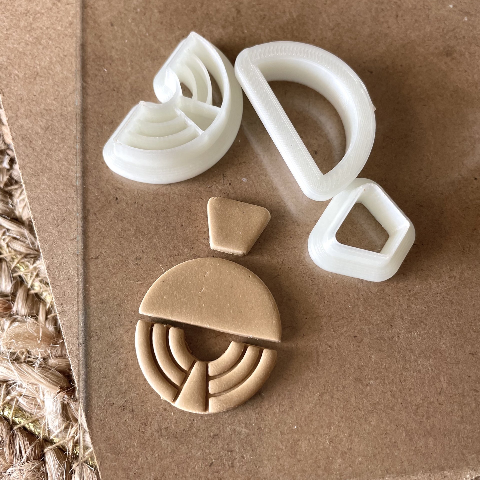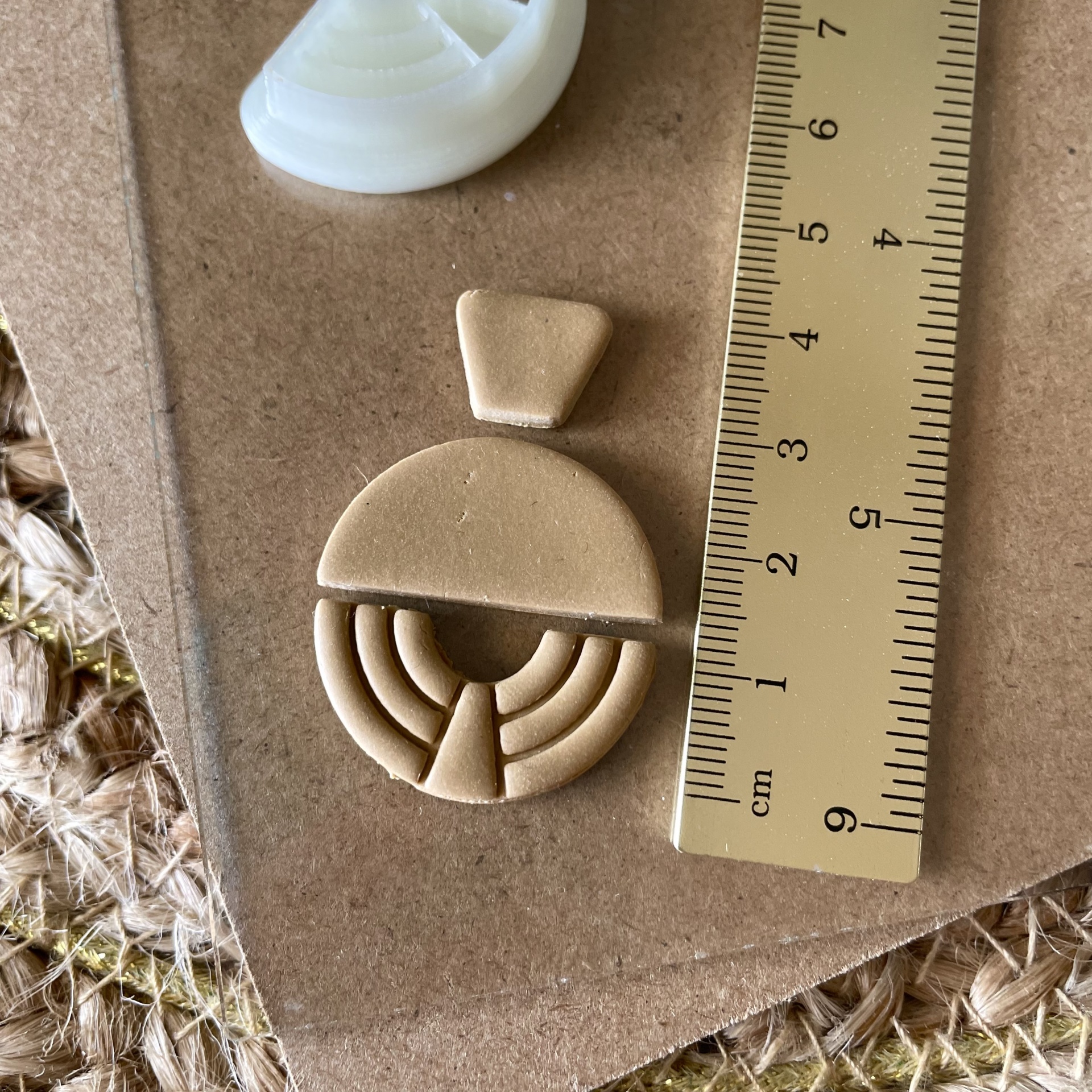 • Brincos bege geométricos sobre cartão castanho ao lado de régua amarela em fundo de tecido grosso