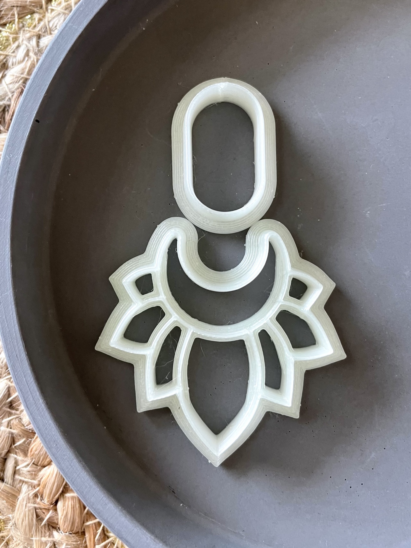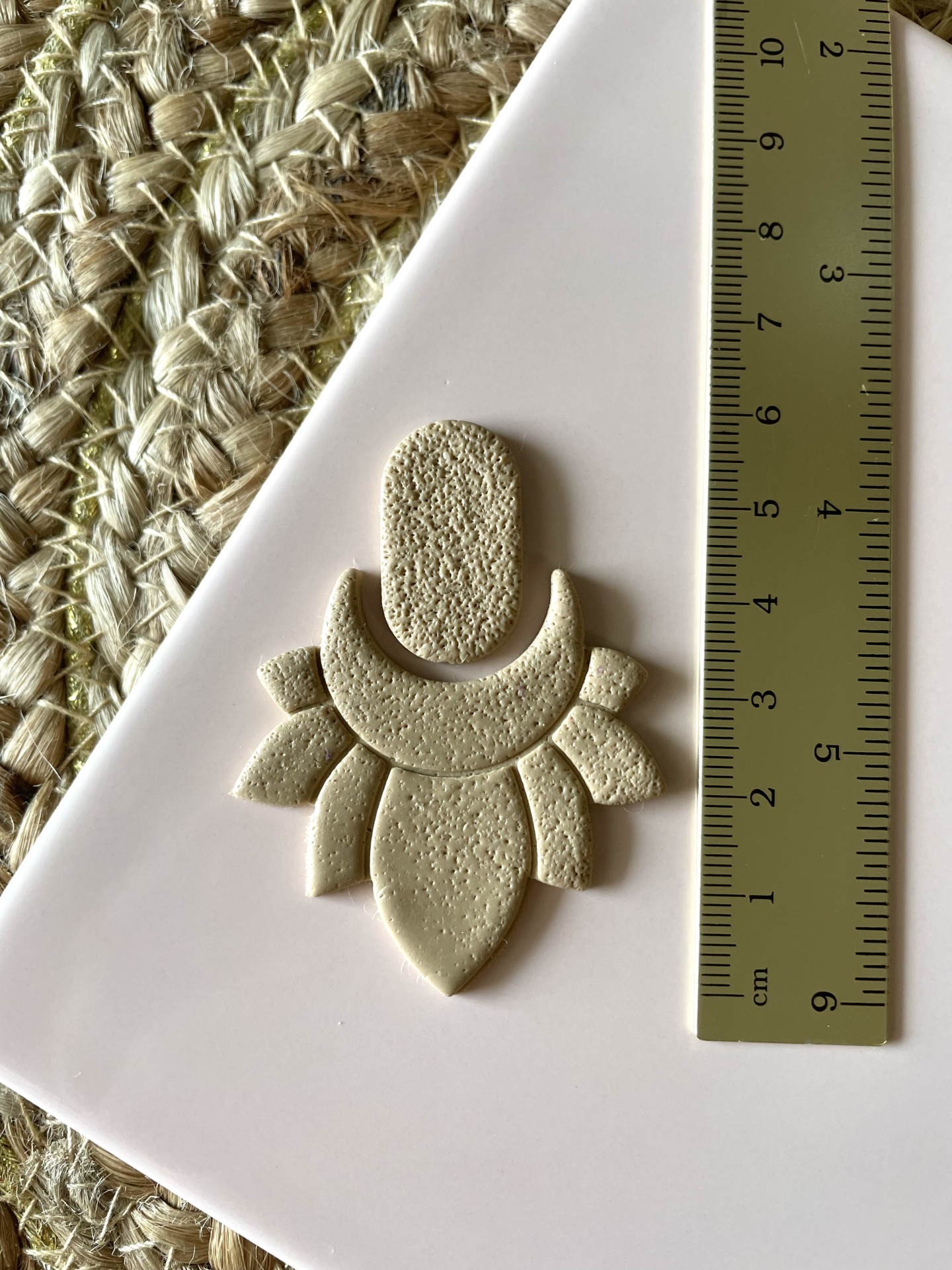 • Brinco bege texturizado com formato geométrico num prato branco junto a uma régua amarela
