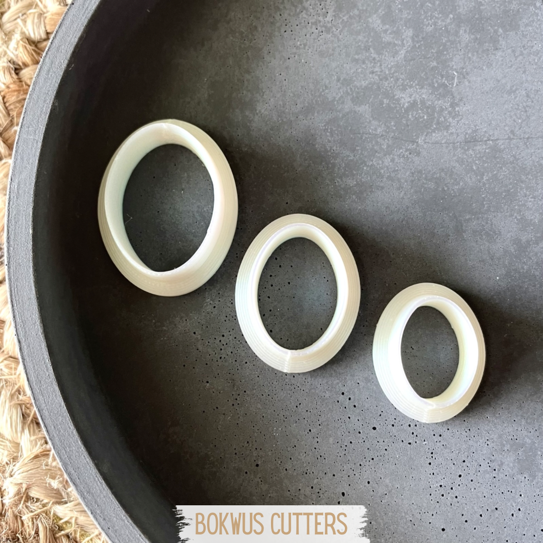 • Três cortadores ovais brancos de tamanhos diferentes numa panela preta com textura