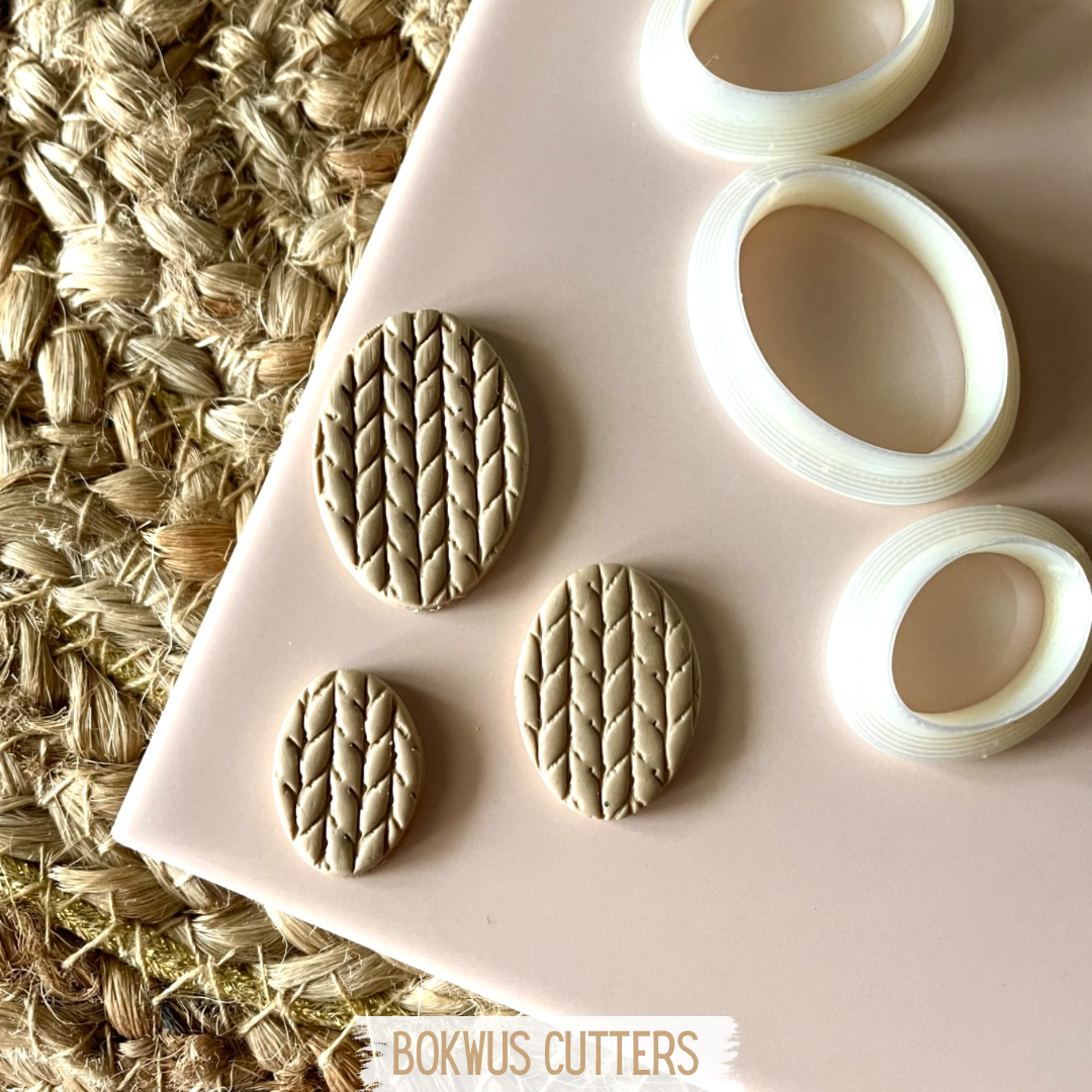 • Cortadores ovais de pastelaria com padrão trançado em tom bege e anéis de moldar brancos sobre base creme