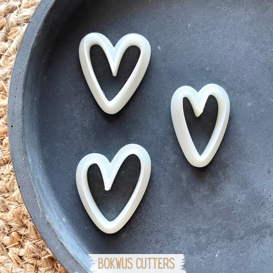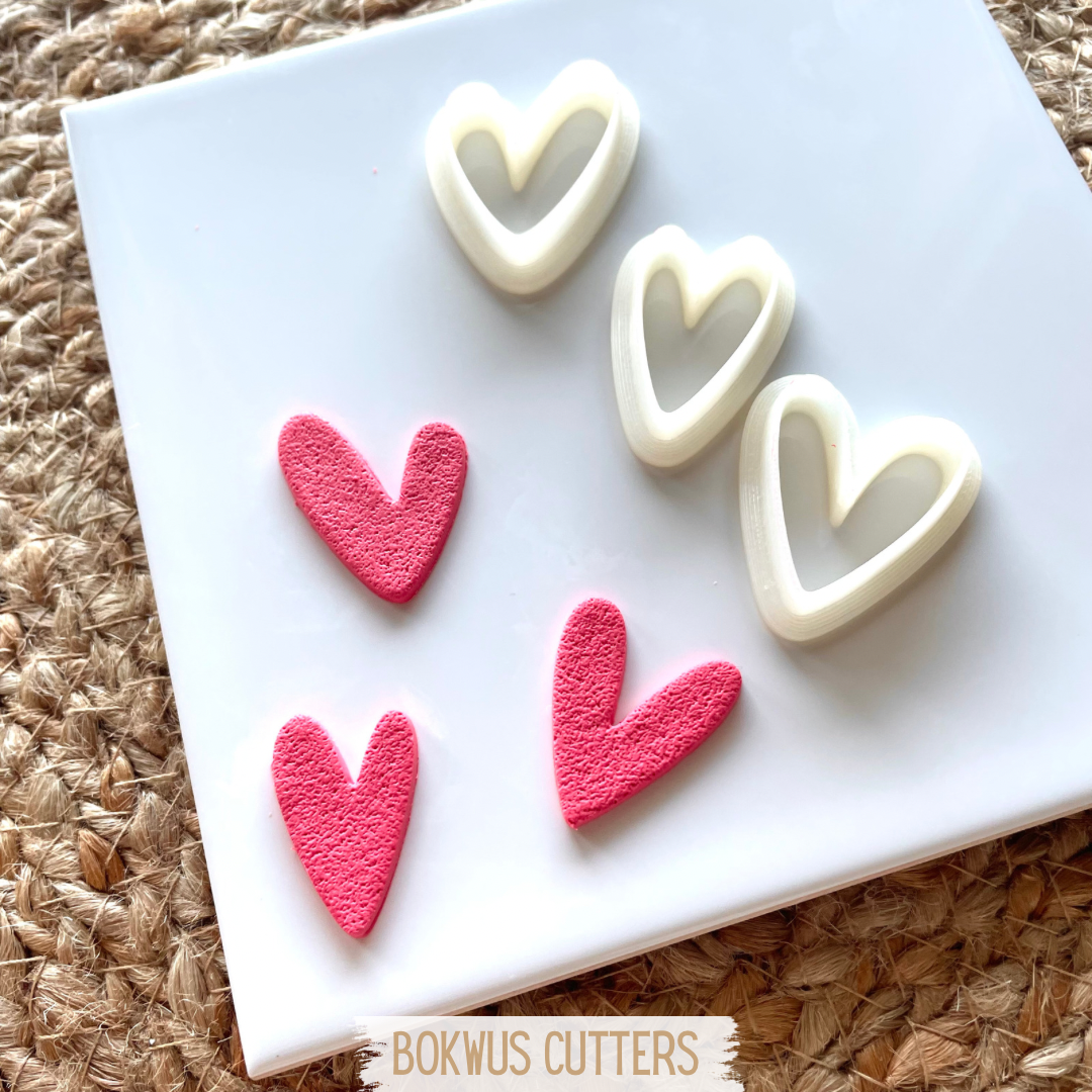 • Cortadores de biscoitos em forma de coração em branco e vermelho texturizado sobre placa branca e etiqueta BOKWUS CUTTERS.
