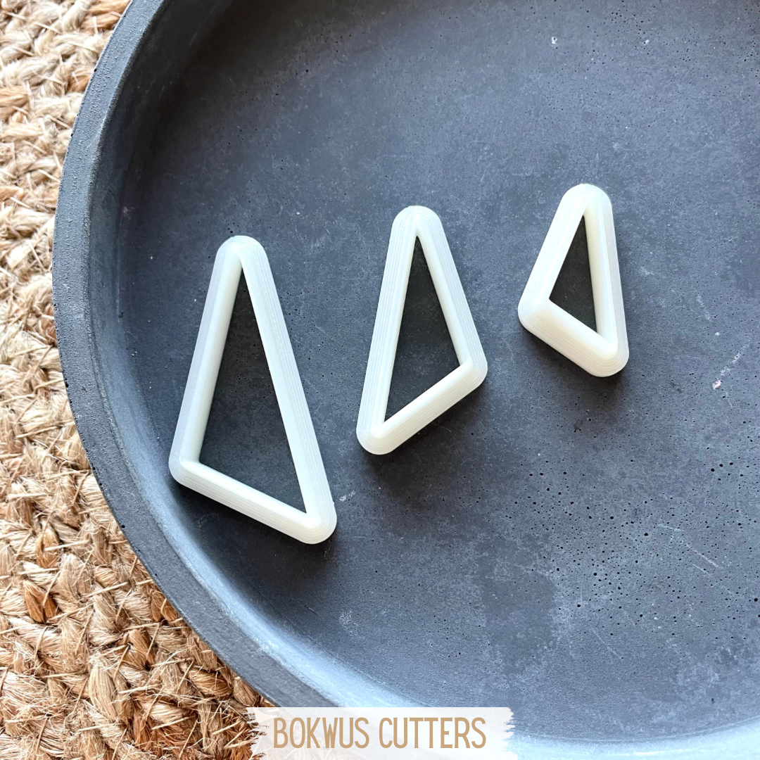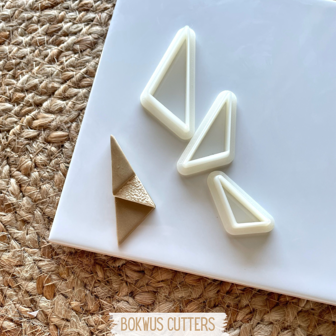 • Cortadores triangulares brancos e peça cortada sobre superfície branca com tapete natural e texto BOKWUS CUTTERS