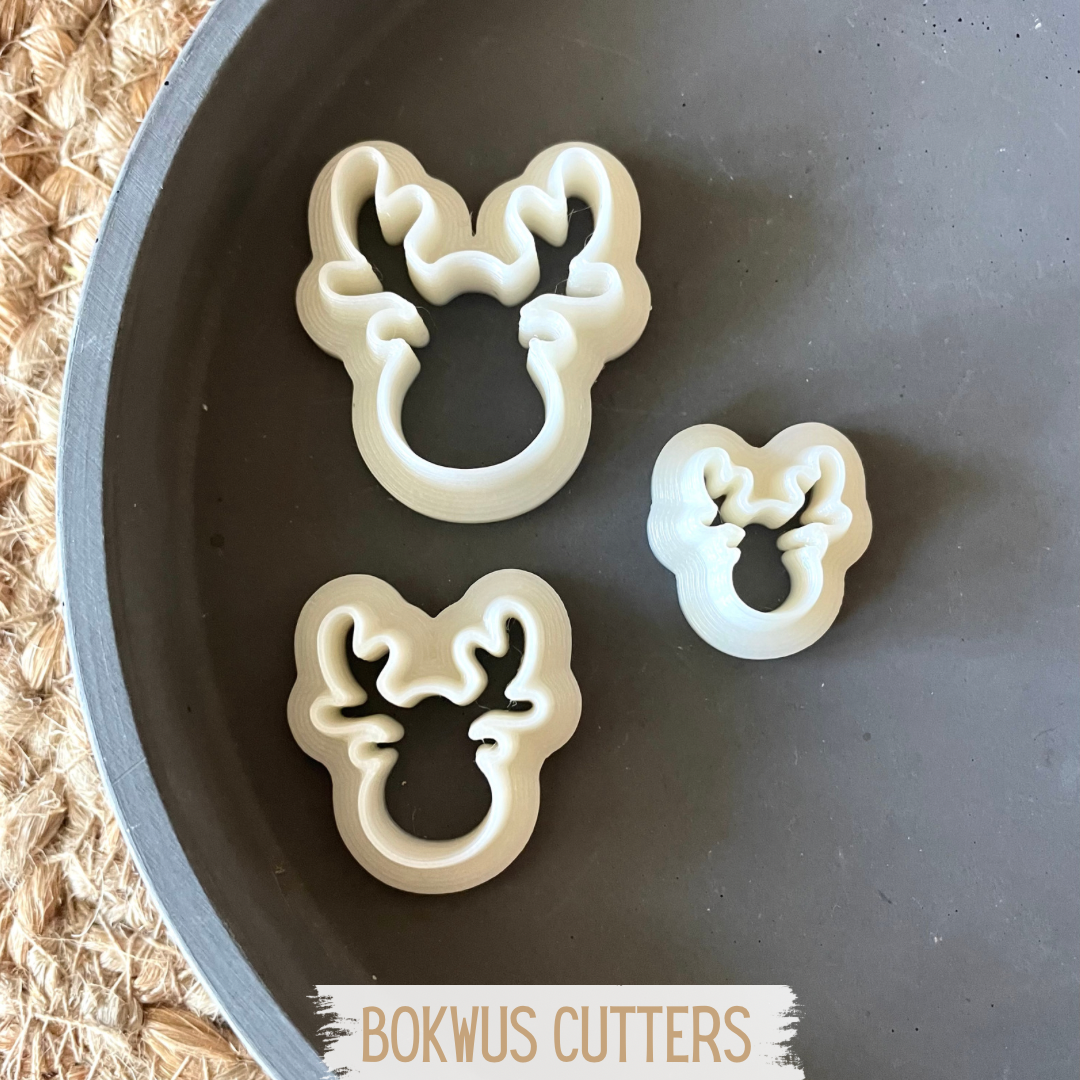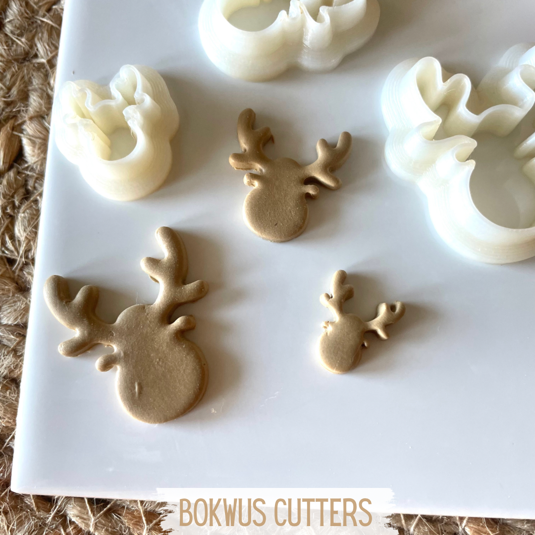 • Três cortadores de biscoitos brancos em forma de cabeça de rena numa superfície cinzenta