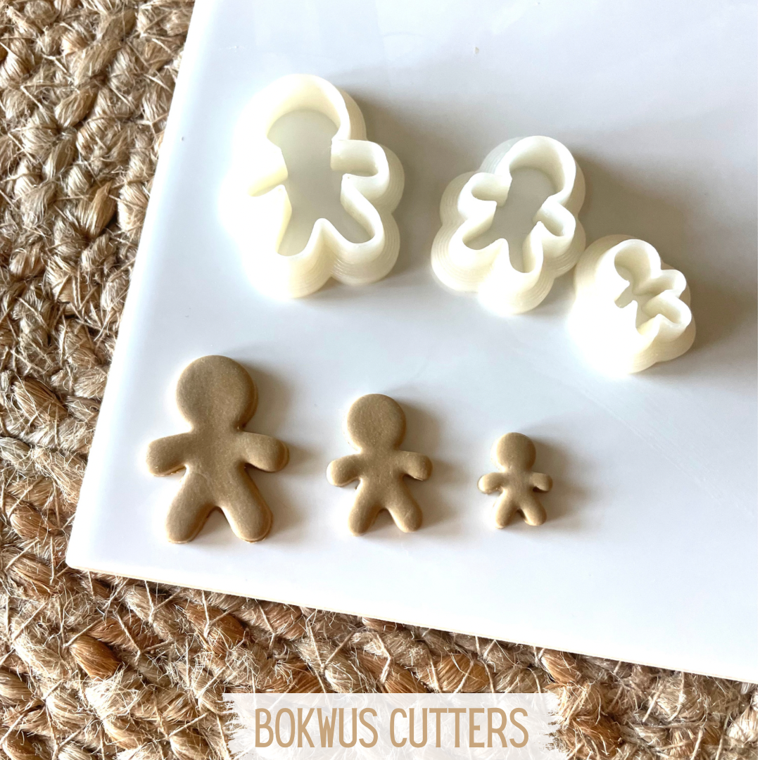 • Cortadores de massa em forma de boneco de gengibre e biscoitos correspondentes sobre base branca