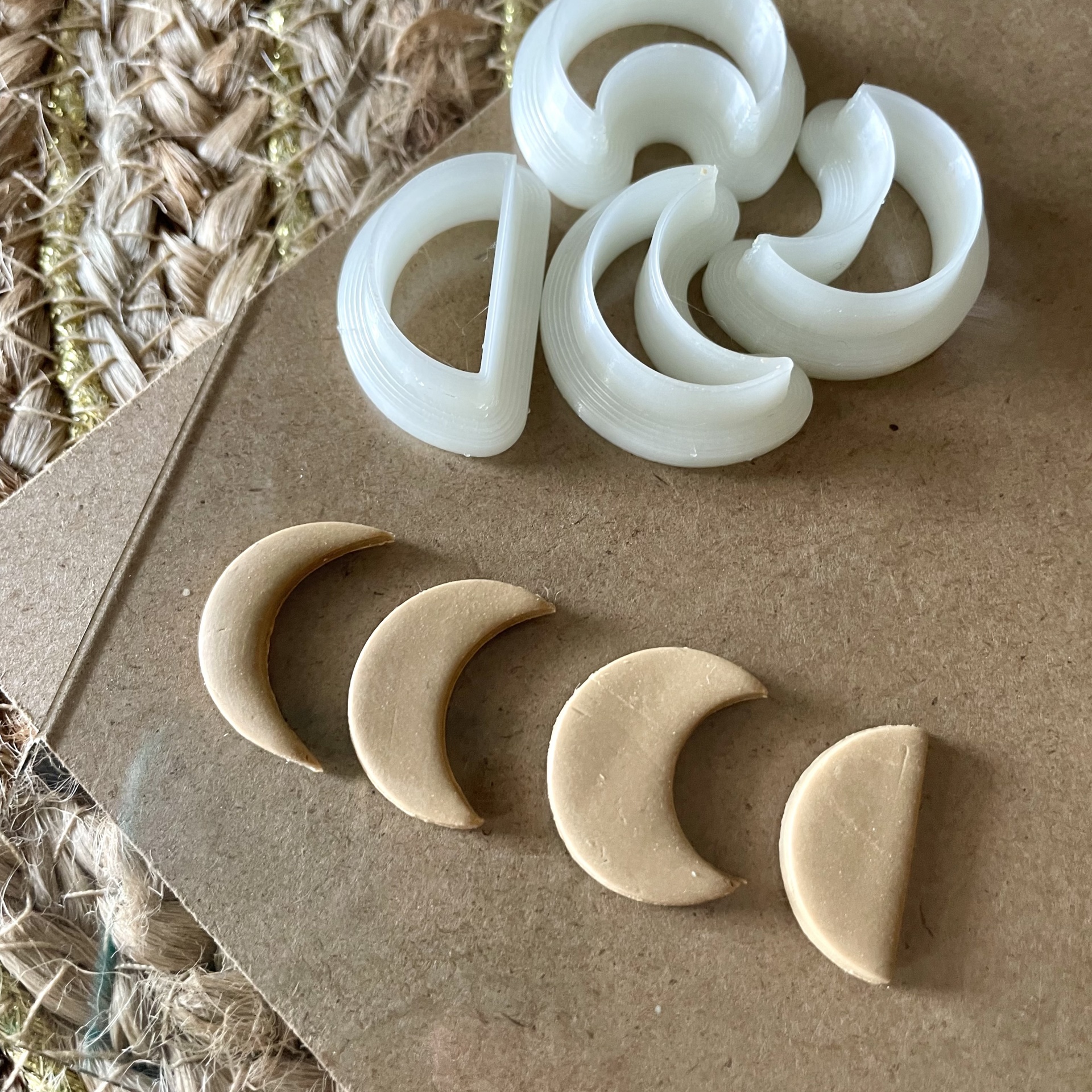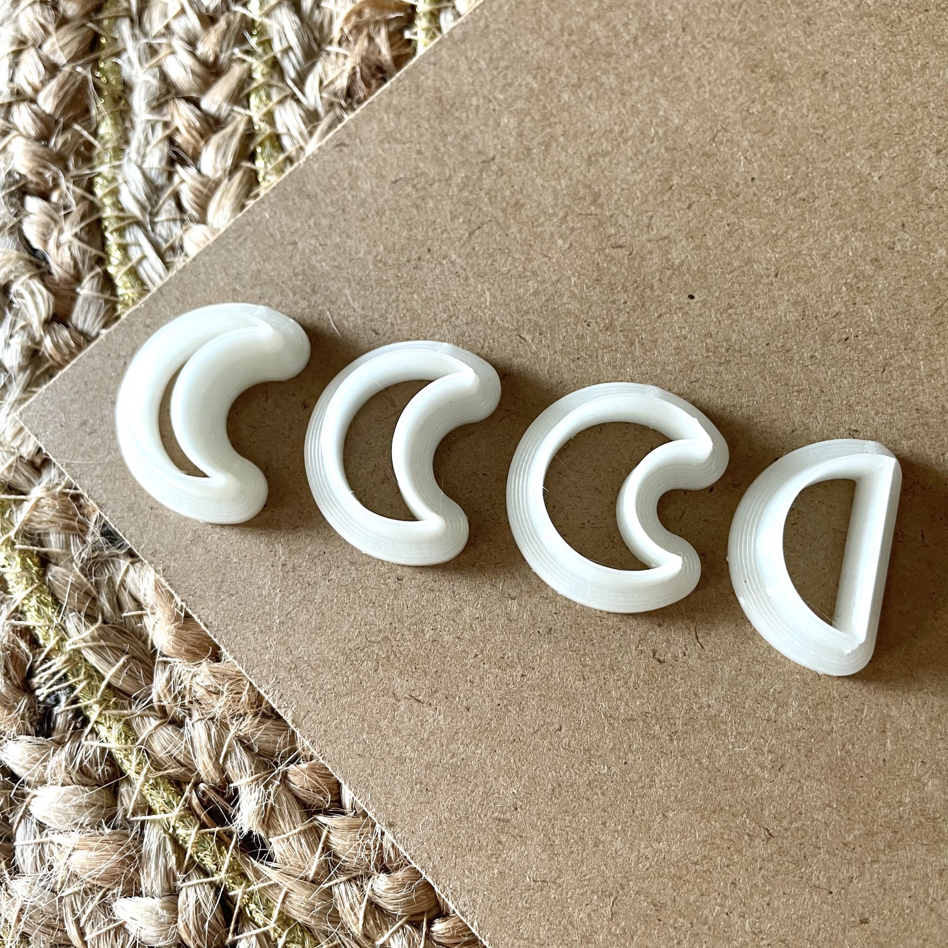 • Peças de joalharia semicirculares brancas e bege sobre superfície castanha e tapete de fibras naturais