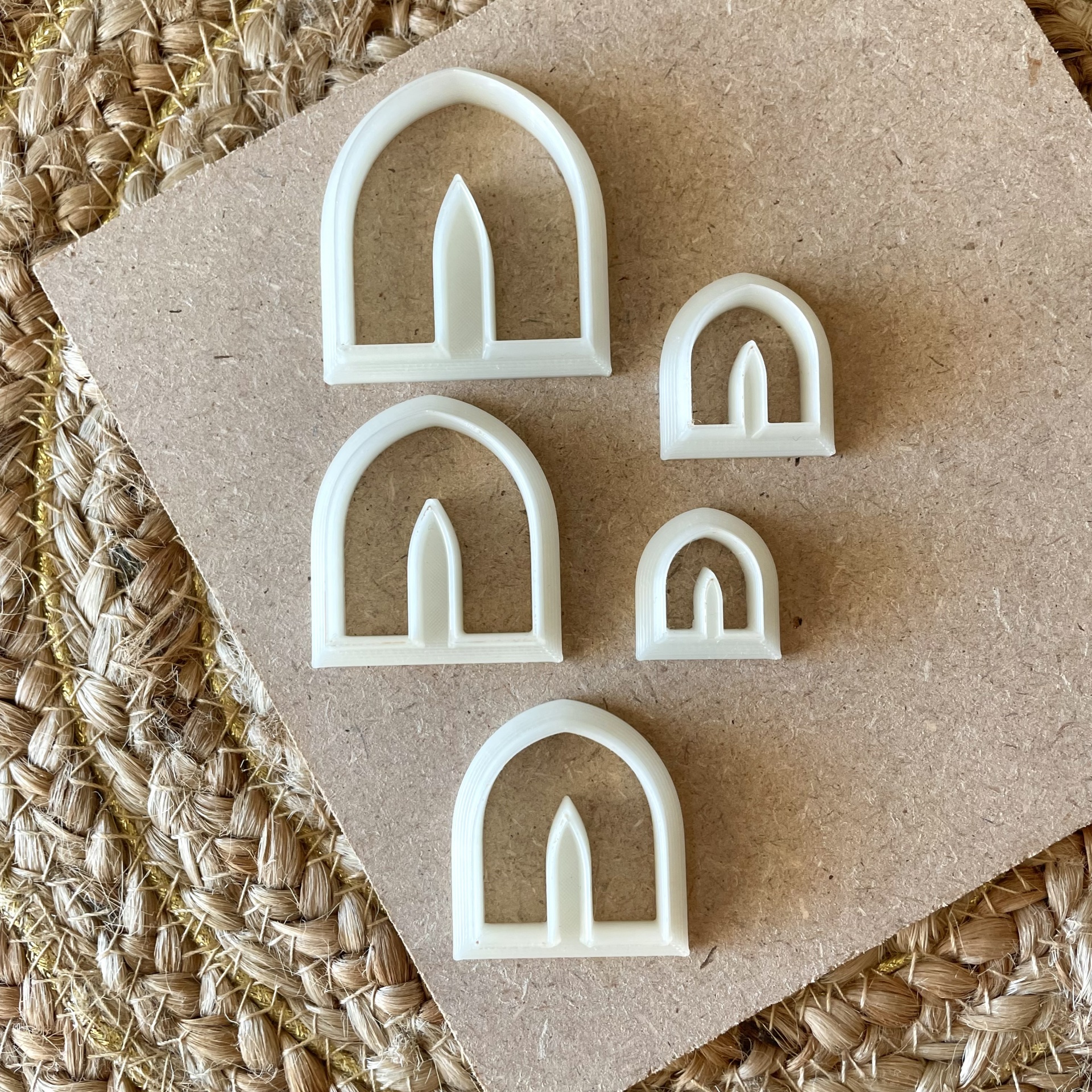 Conjunto de cortadores de massa brancos em forma de arco com ponta interna sobre madeira e tecido trançado