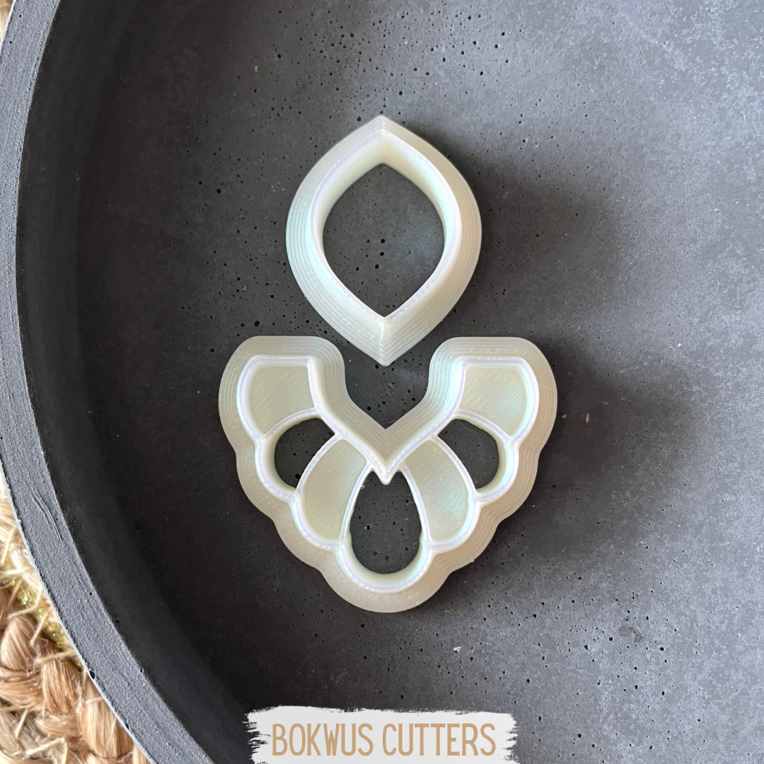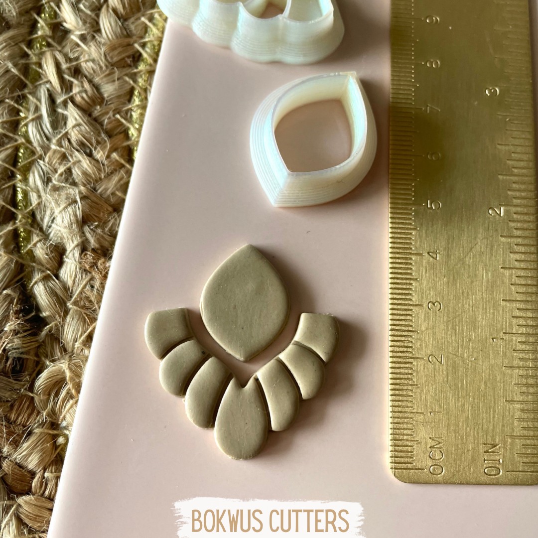• Cortadores e massa modelada em formas de gotas e pétalas ao lado de uma régua dourada sobre superfície rosa com texto BOKWUS CUTTERS.