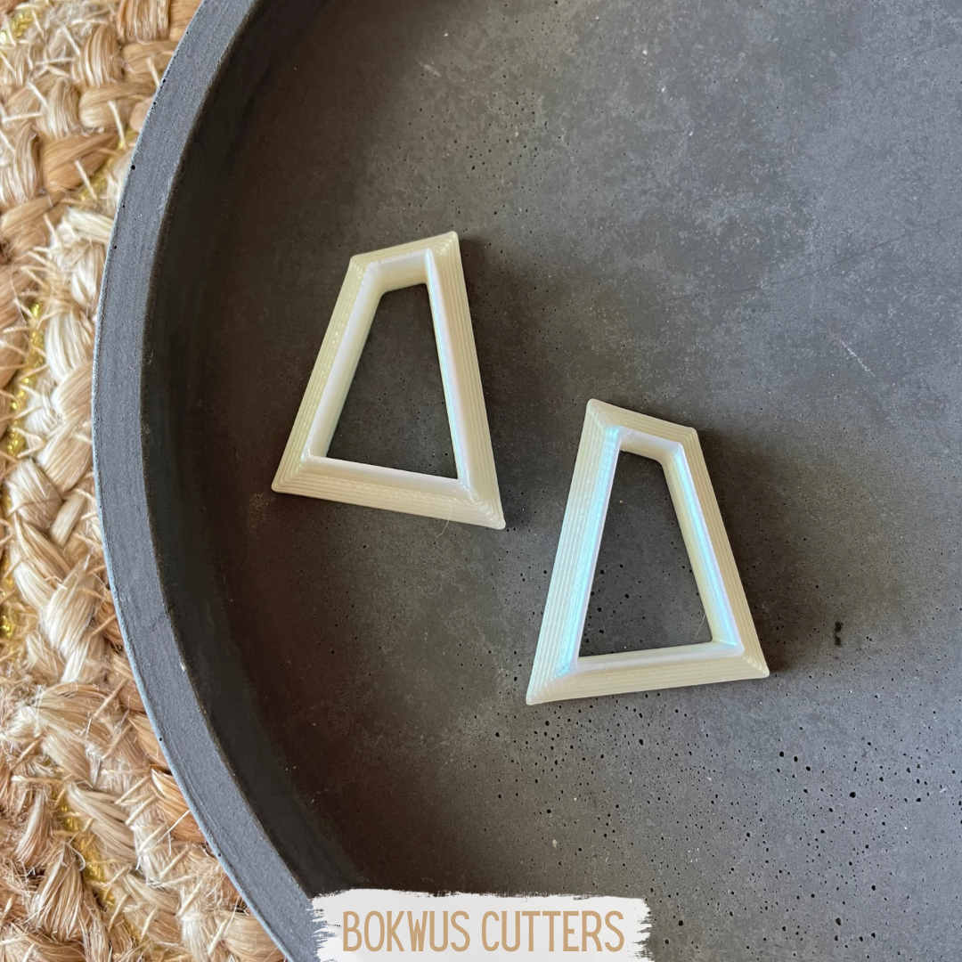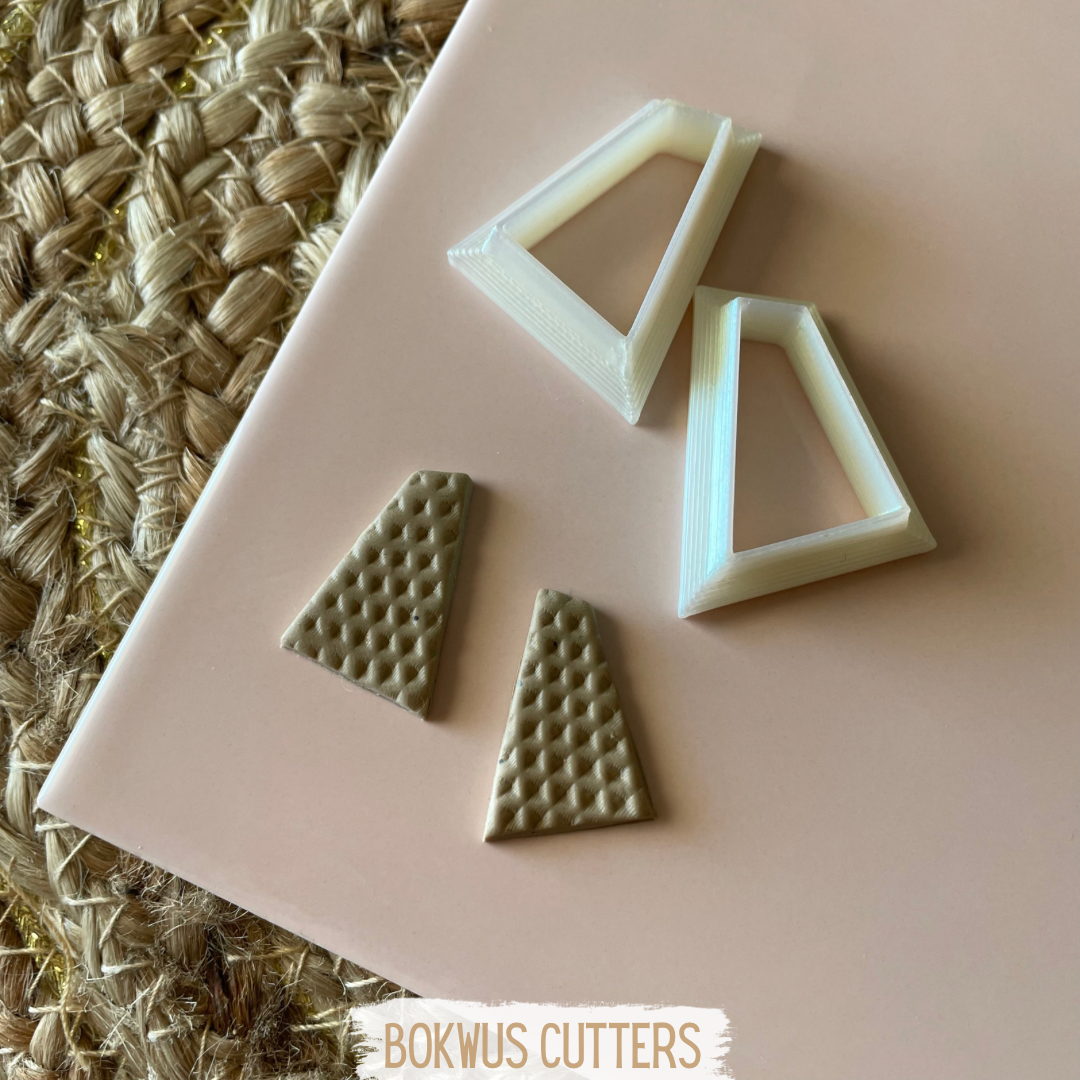 • Dois cortadores trapezoidais creme em superfície escura com base de palha