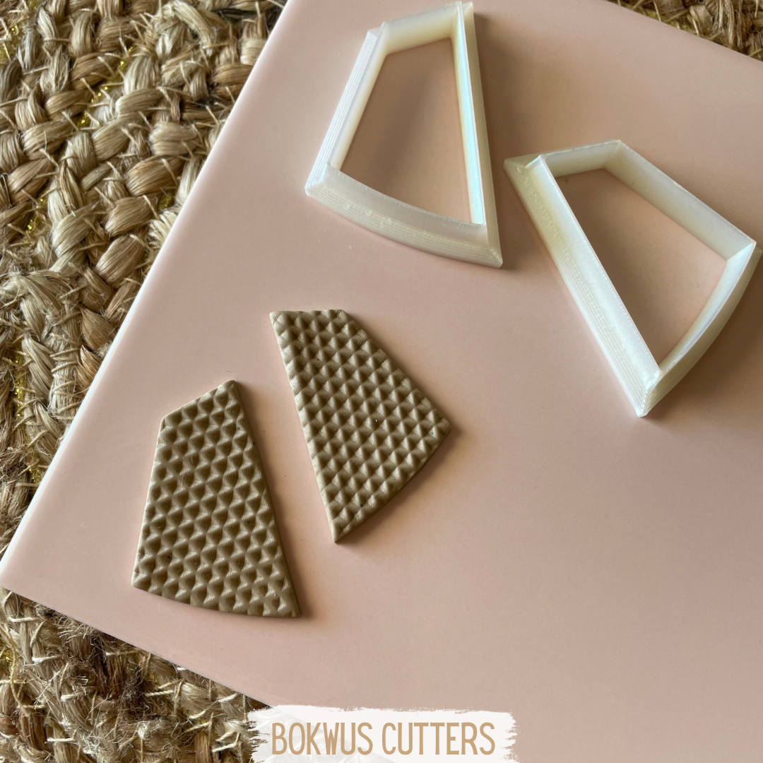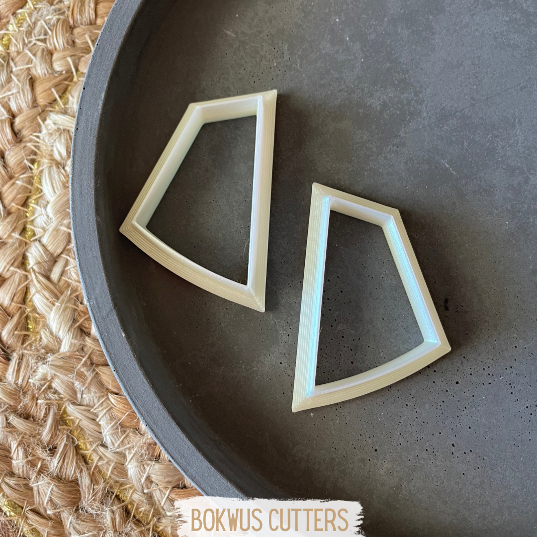 • Dois cortadores de massa ou biscoitos brancos em forma de trapézio numa bandeja escura sobre base trançada